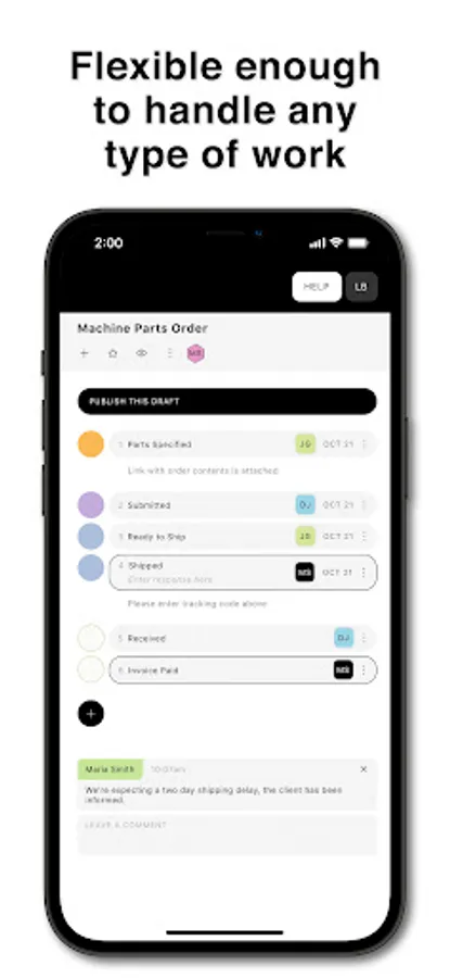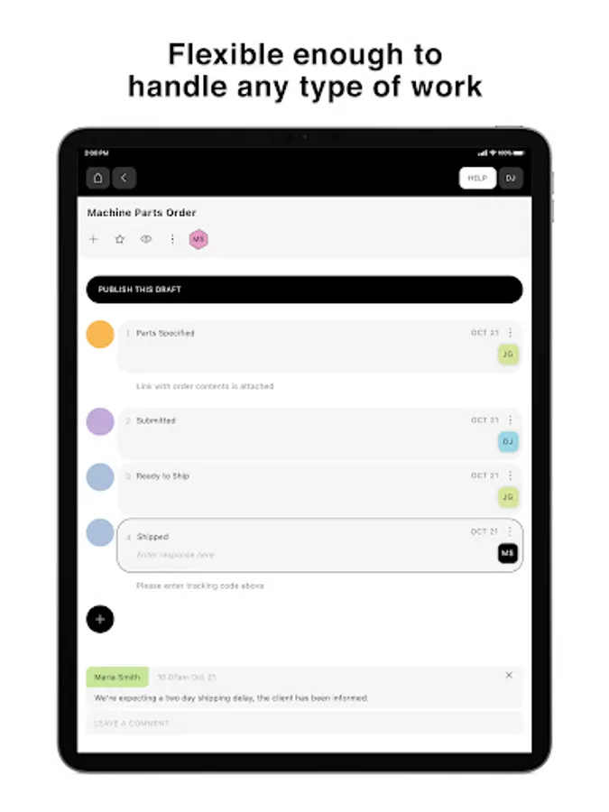 Polydot lets you give the amount of structure you need to a series of next steps. You just name dots that represent the steps, assign them, and then people click them when done. It notifies others on the team as you wish. If you want to standardize the steps in a recurring process all it takes is a single click.