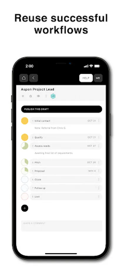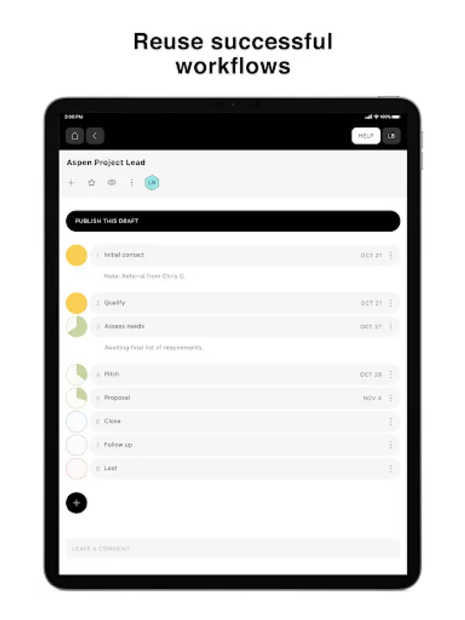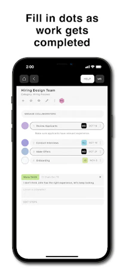 Dots represent steps in the process. As you fill in dots, collaborators get notified (if you wish).