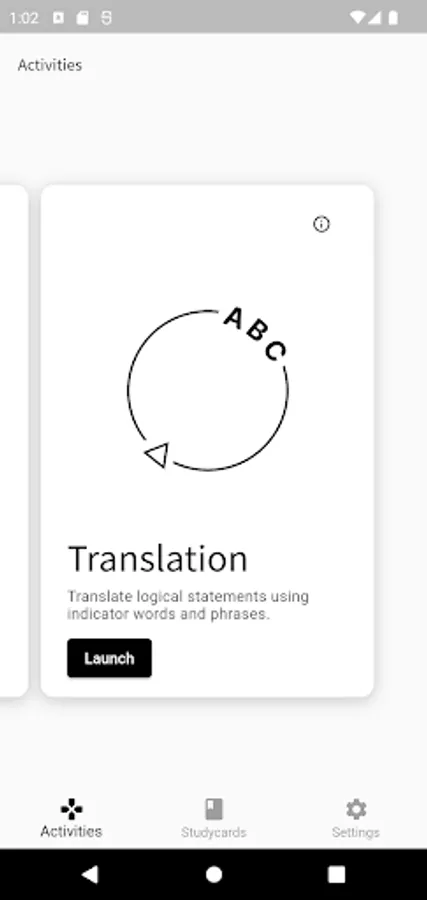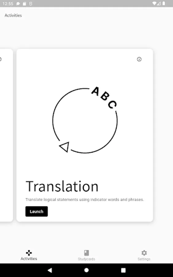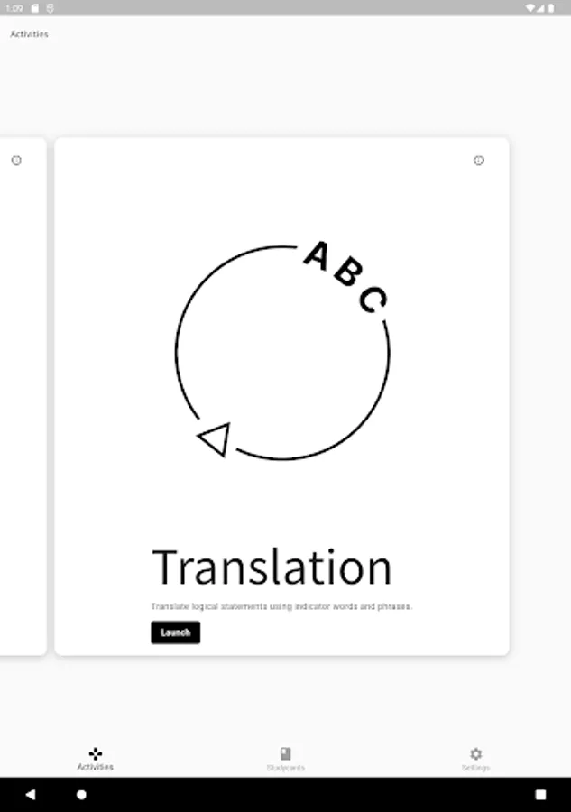 4. Translation: Translation aids the student in translating statements with indicator words and phrases into logical statements. Indicator words and phrases are commonly used in logic books and courses to help the student get a "sense" for how to translate a statement in a human language into a statement in logic. Translation breaks them down into a set of levels and allows the user to set new scores as they reach new levels of proficiency.