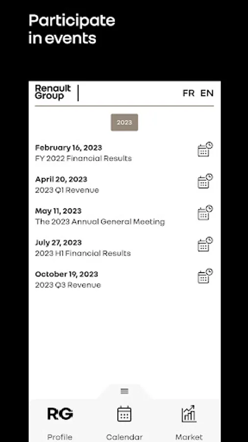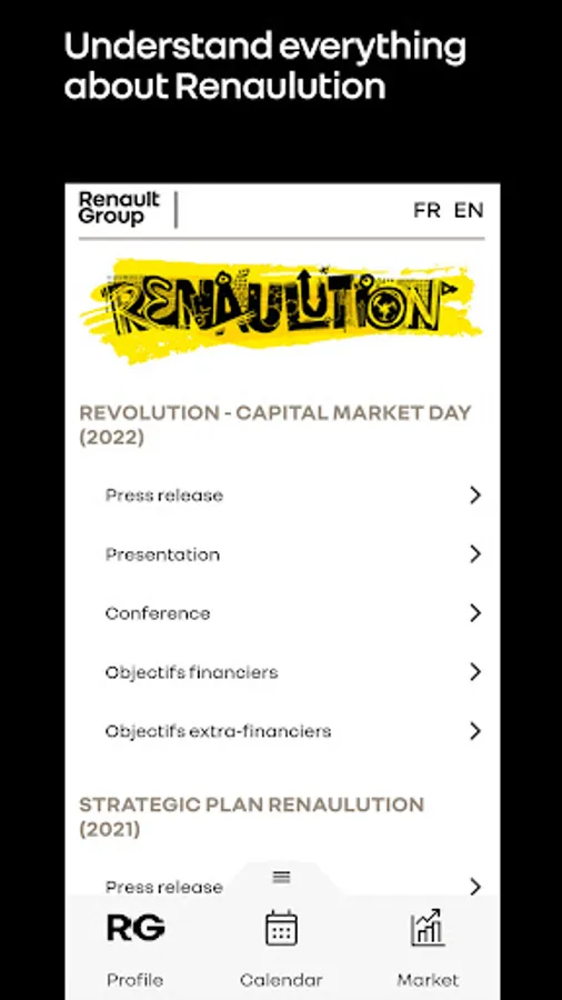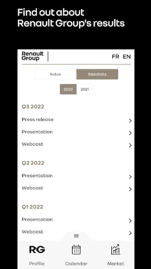 The Renault Group Invest'R application allows investors, analysts, individual shareholders and the media to get information and follow Renault Group's financial news in real time.