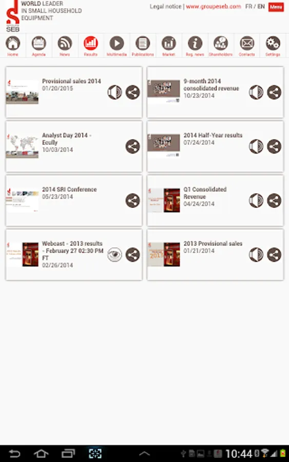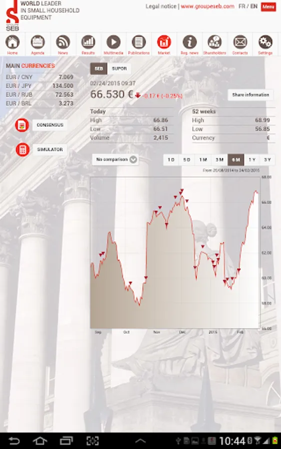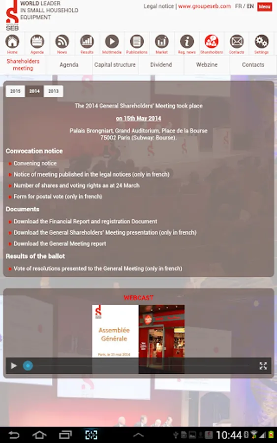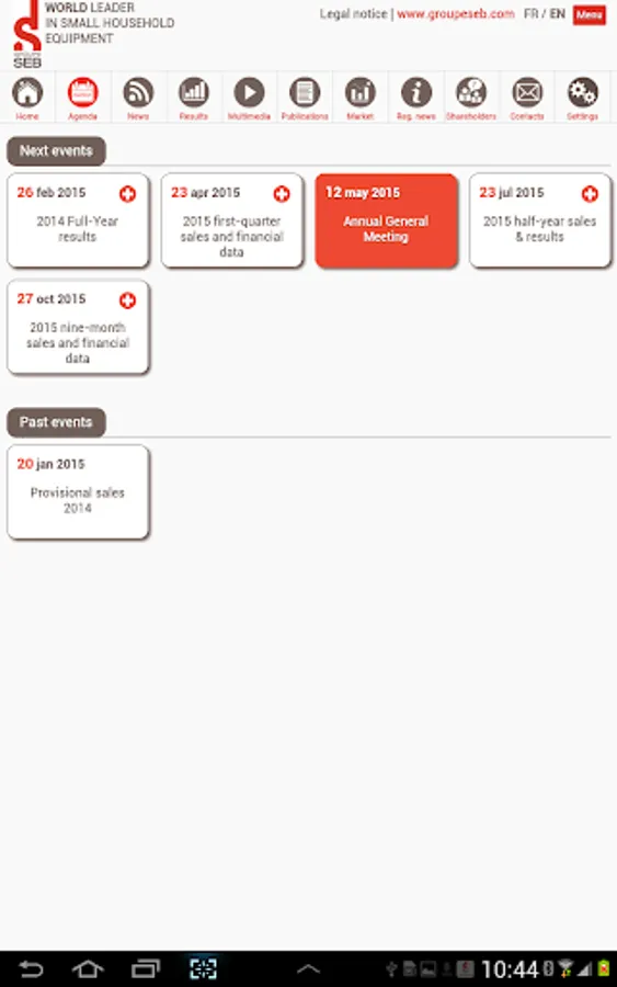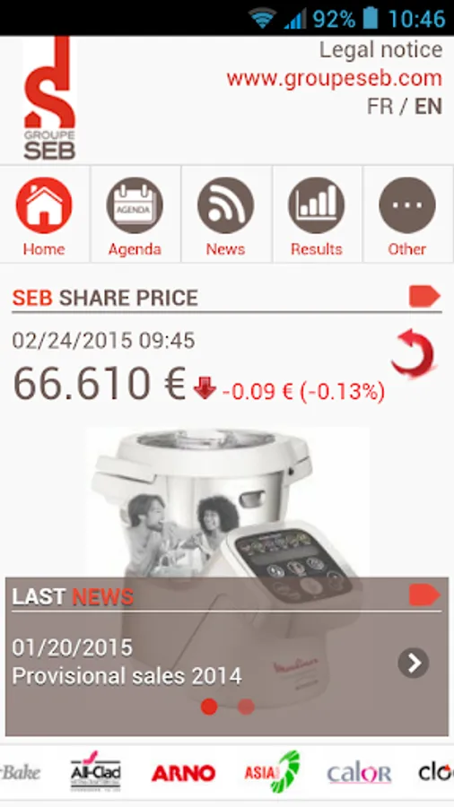 Groupe SEB IR is Groupe SEB's application for mobiles and tablets aimed at all shareholders and investors. It allows them to keep up to date with all the financial news and to find the Group's main publications (annual report, reference document, financial presentations, press releases, documents for the annual general meeting, webzine, webcasts and audiocasts), live share prices, regulated information etc.