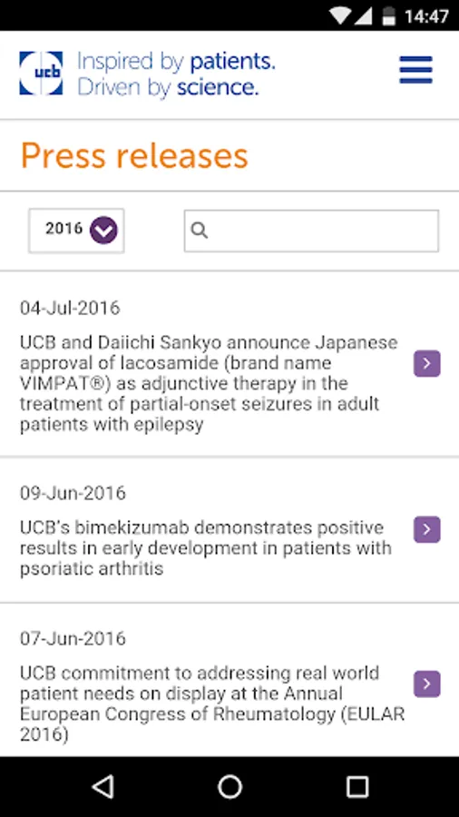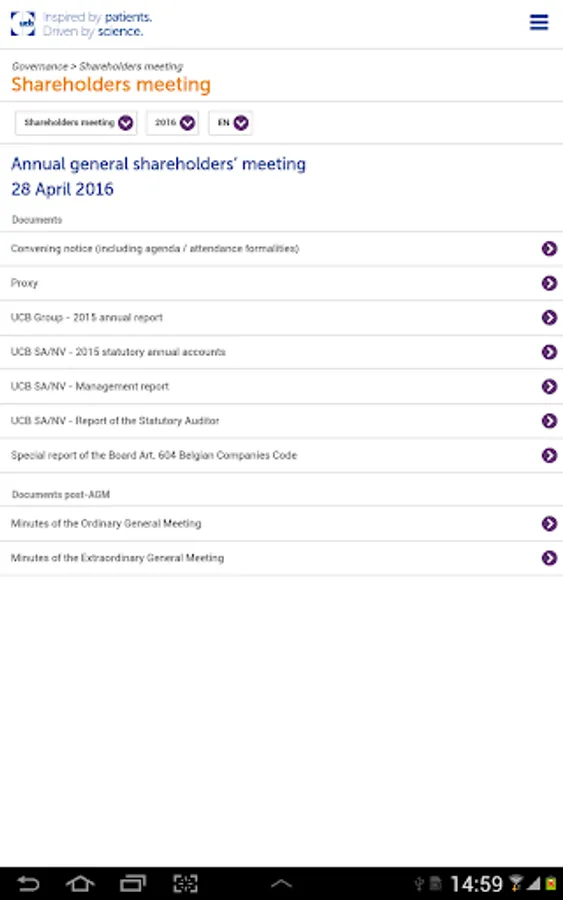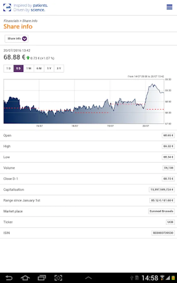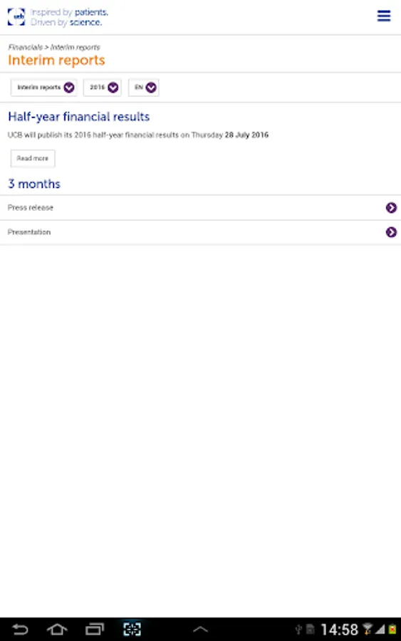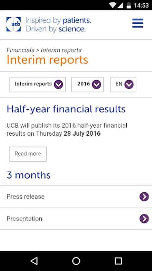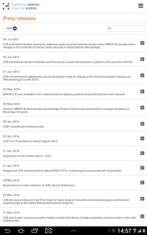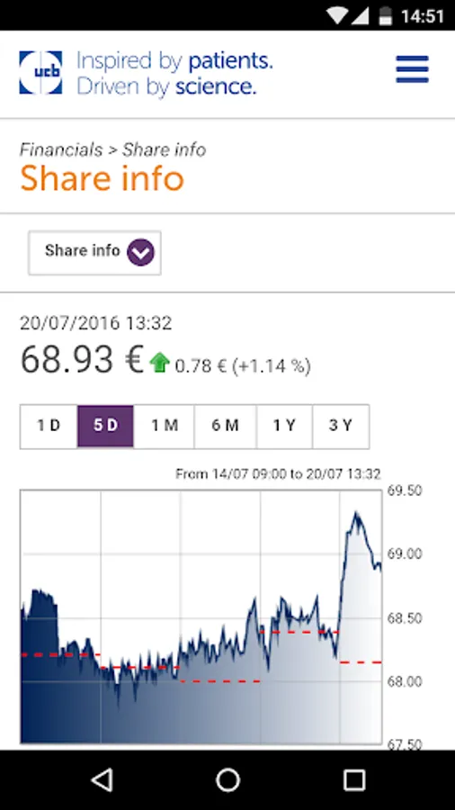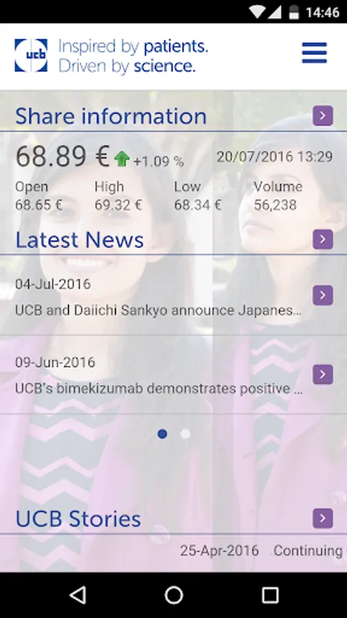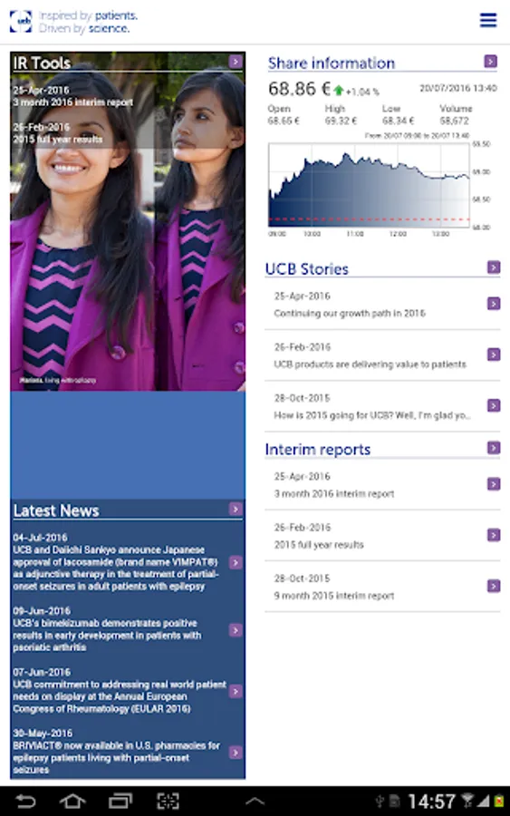 UCB IR App gives you easy access to the latest financial information on UCB when you are on the move, in a format optimized for smartphones and tablets and aimed for all shareholders and investors. The App financial contents, namely share price information, financial news, publications (annual reports, code of conduct, financial presentations, press releases, documents for the annual general meeting, stories, webcasts and conference calls), company information, etc., are continuously synchronized with the latest information available on the Investor Relations section of www.ucb.com.