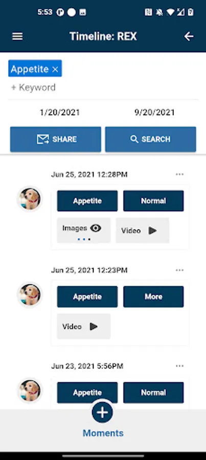 Easily manage your pet's health in one place with SymptoMedic Pets. Your pet's timeline and moments can be sorted and shared with your veterinarian to provide a more accurate description of your pet's health between visits. Moments are time/date stamped so all you need to do is enter your pet's symptoms. Keep track of symptoms relating to cancer, chemotherapy, radiation, surgery, heart disease, allergies, behavior, medications, and medication changes. Especially effective for tracking and managing chronic diseases.