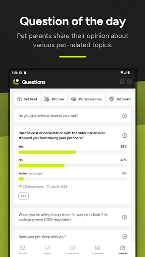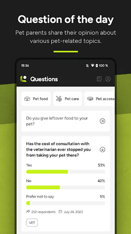 - Questions of the day: pet parents share their opinion about various pet-related topics.