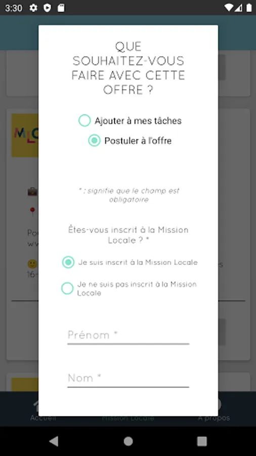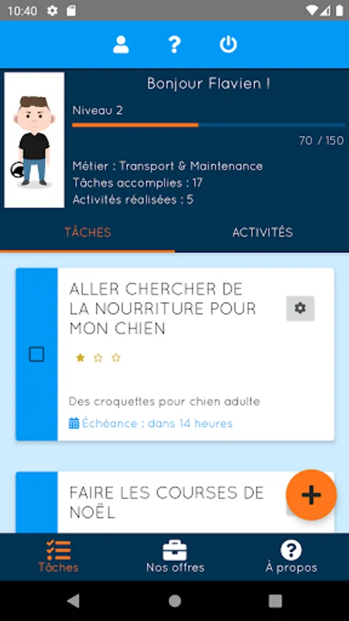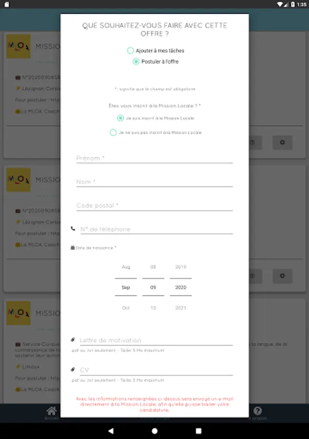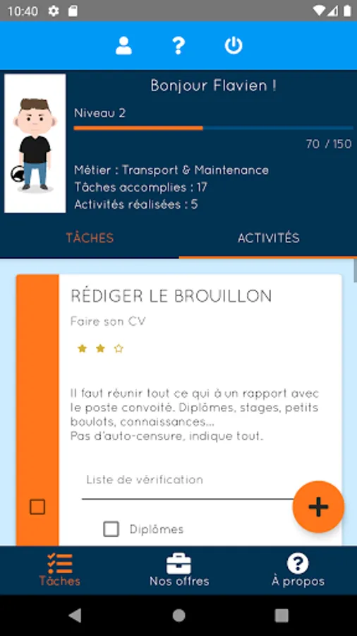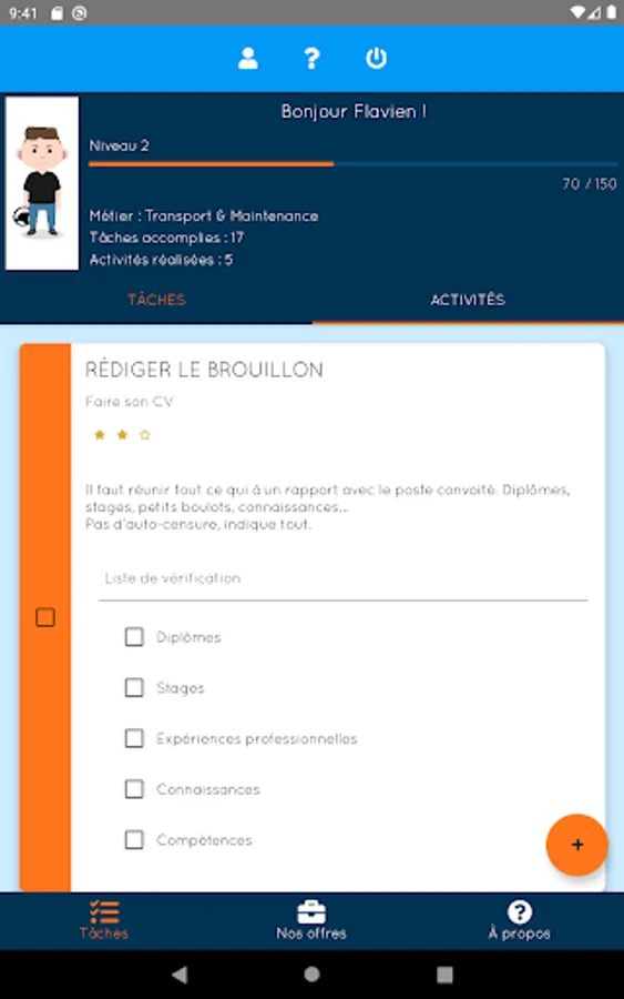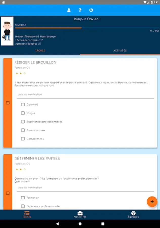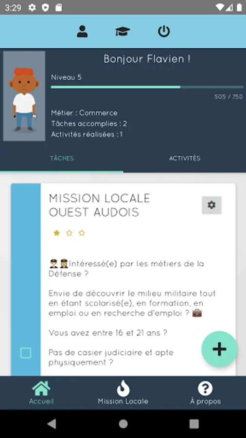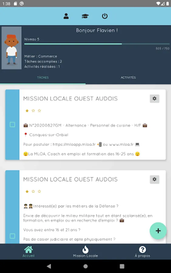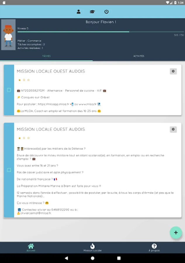 - Creation of tasks designed by the Mission Locale Ouest Audois and to be completed in the form of quests and personal objectives and many other features!