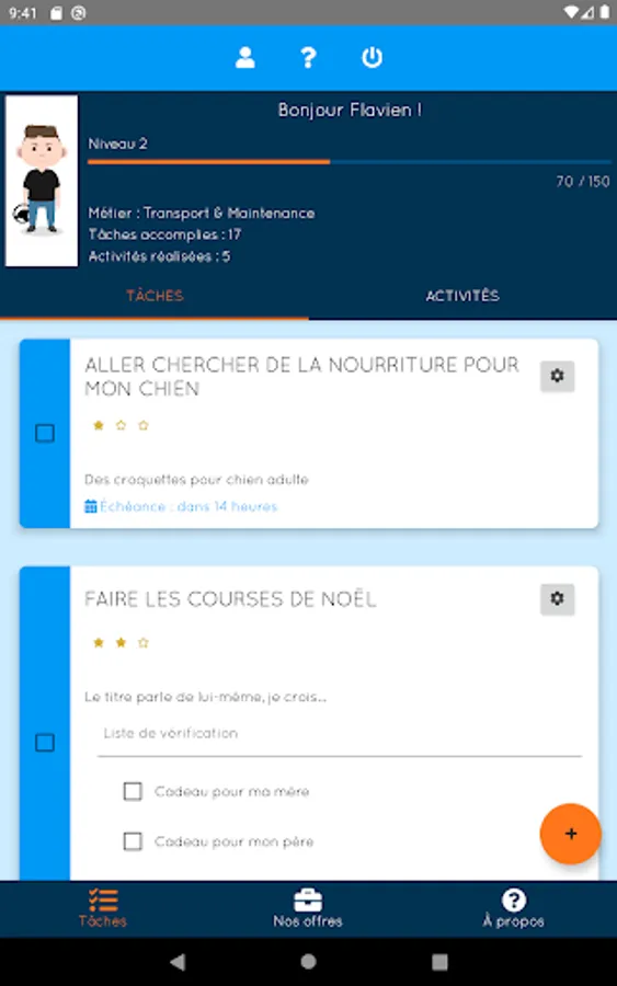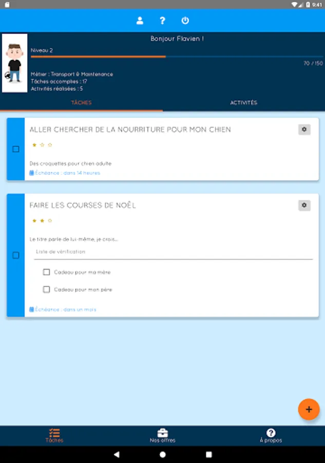 - Management of own tasks (creation, modification, deletion, completion, experience)