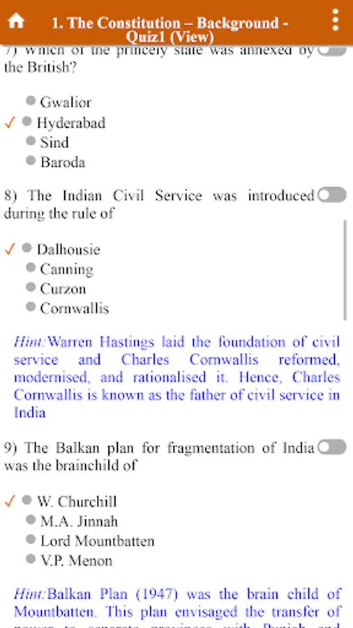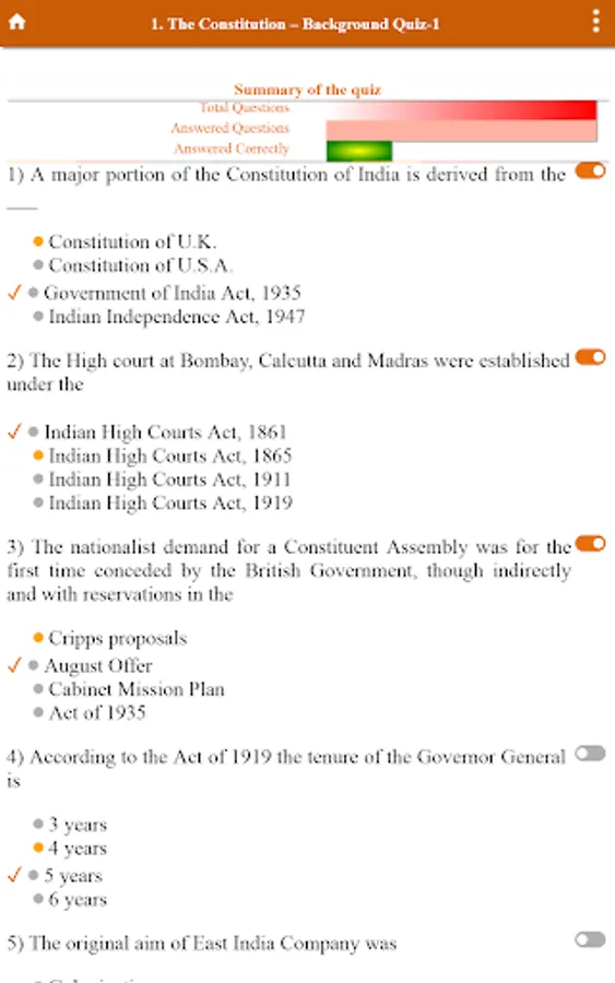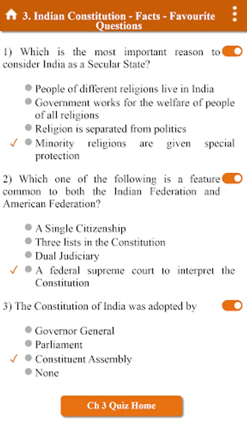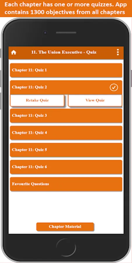 Apps screens are designed such that easy navigation is maintained between study material, quiz, review quiz & view book marked Favourite objective questions on Constitution of India.