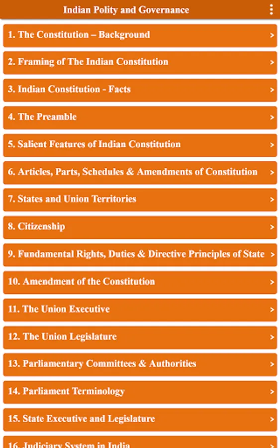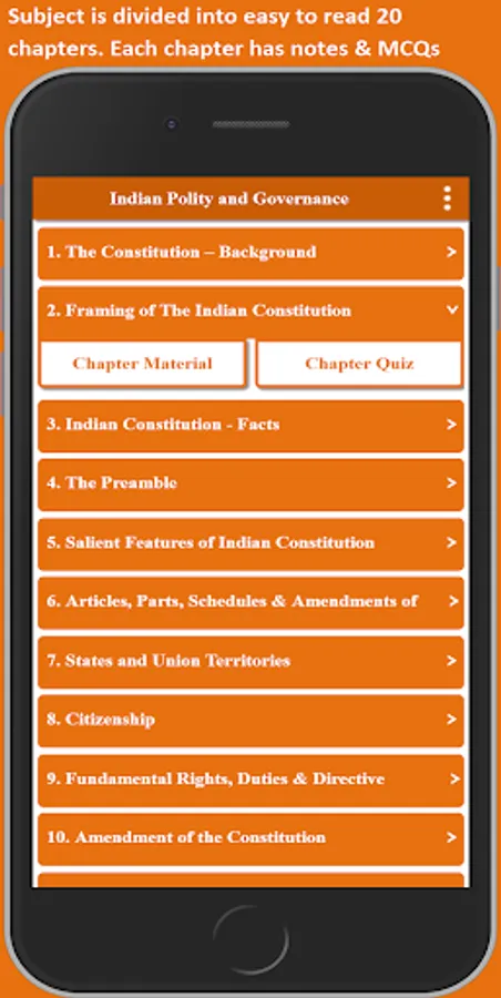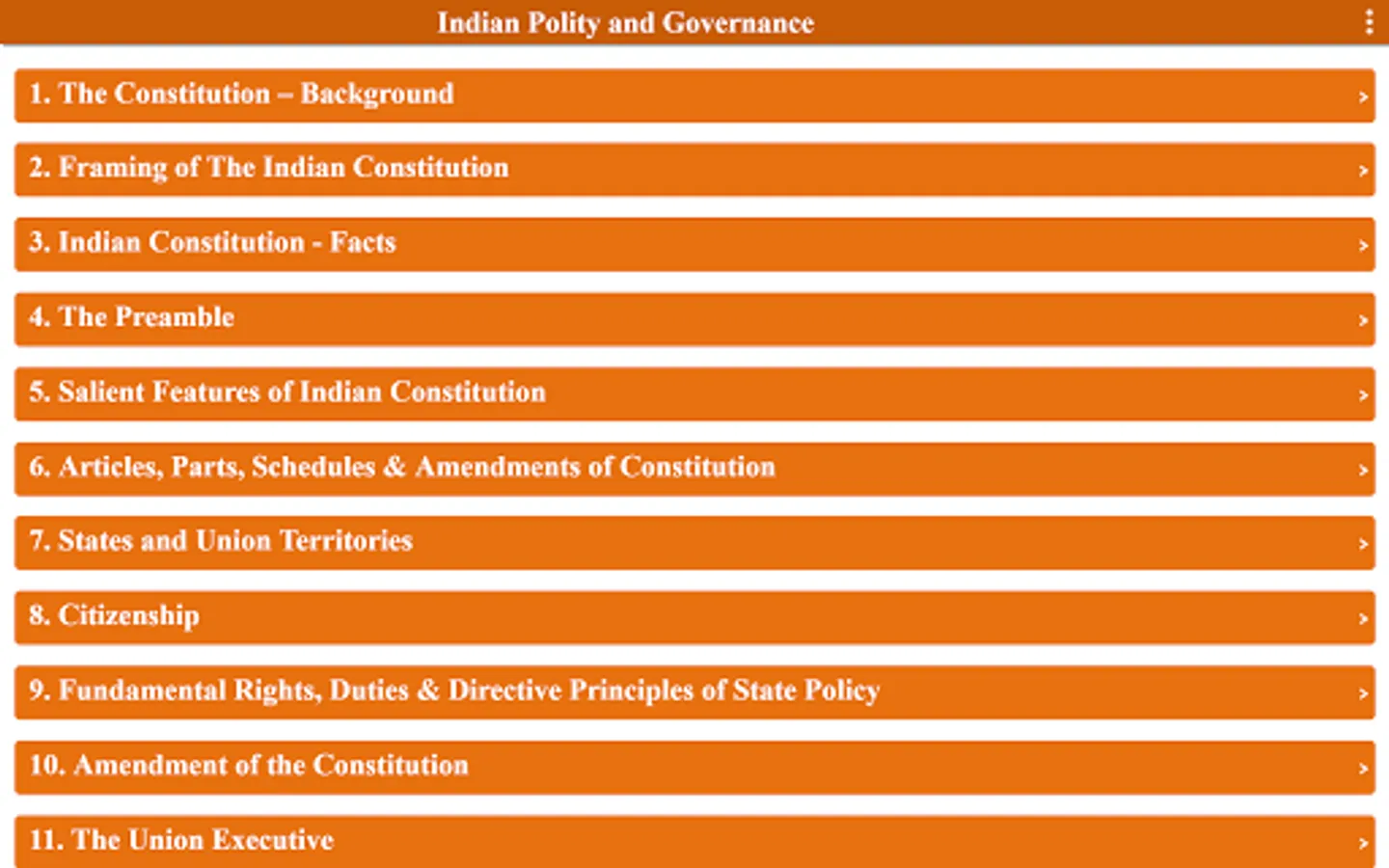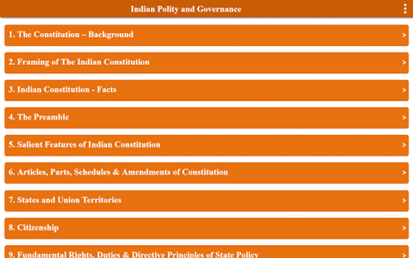 Indian Polity app contains 21 concise chapters and followed by quiz on topics of Constitution of India, Indian Polity and Governance that make you master on the constitution of India.