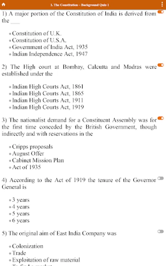 App allows Readers in 1)book mark the favourite questions on constitution of India 2)changing the modes between night mode & day mode 3)allows changing the font size.