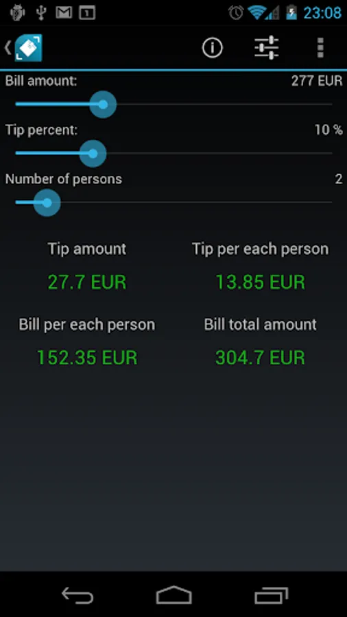 * Tip calculator not only calculates tip quickly and easily but also helps to split the bill between any number of people and share with them results using e-mail.