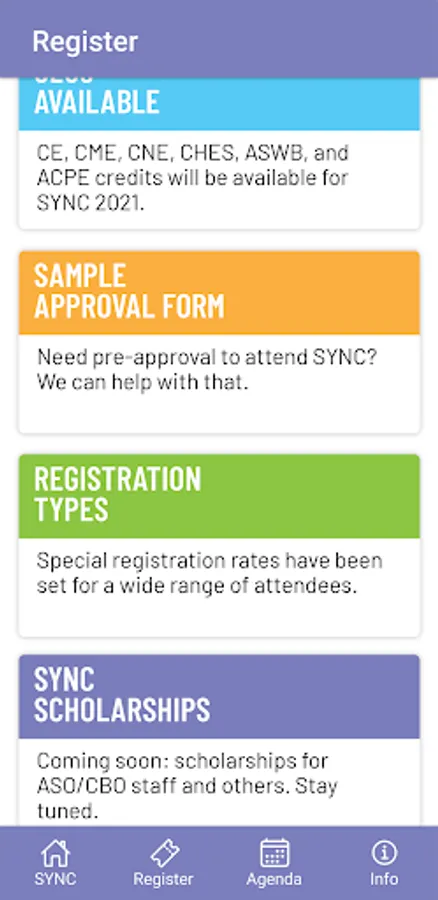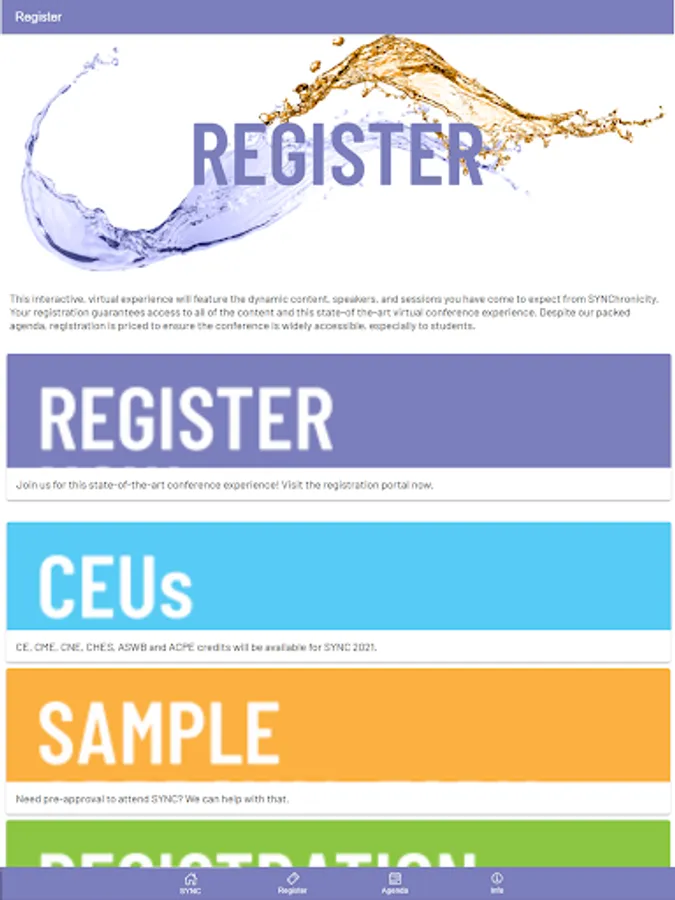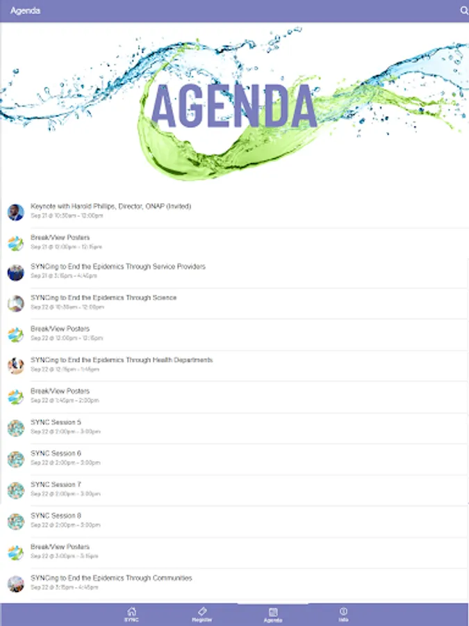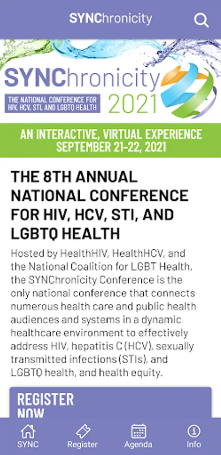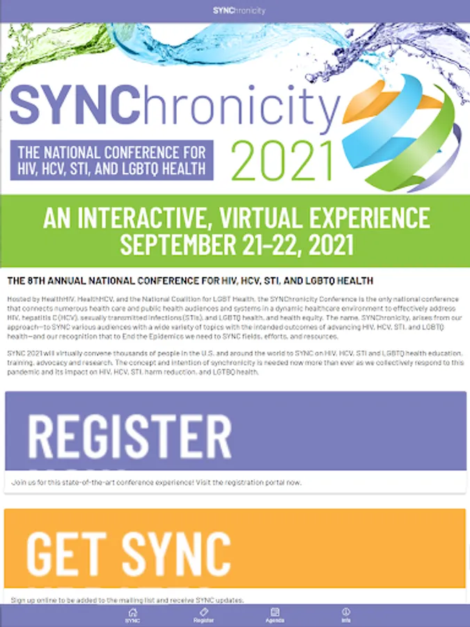 The SYNC Health app brings together medical providers, healthcare workers, state, local and federal government officials, faith and community-based organizations, and others addressing HIV, HCV, STI, and LGBTQ health to “SYNC” systems, data, programs, models, interventions, and policies in this dynamic healthcare environment. In addition to content related to the annual SYNChronicity Conference, this app provides users updates and access to resources and online training.