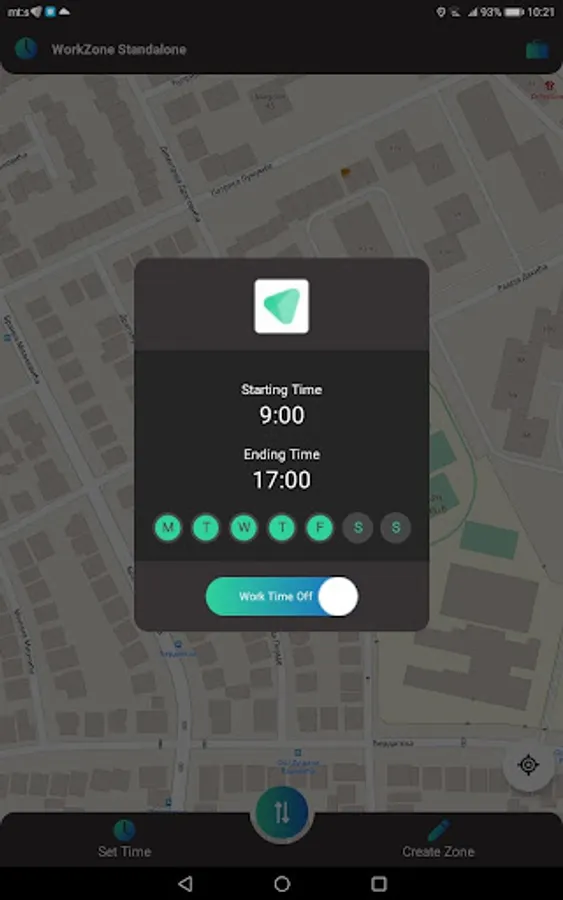 Add starting hours and ending hours using the 24h format. An AM-PM format can also be implemented. By setting up the workdays and the working hours, you limit the App activity, which saves your mobile device’s battery. This is why the service is not available outside of business hours unless you check in manually by clicking on the “Sync Now” button.