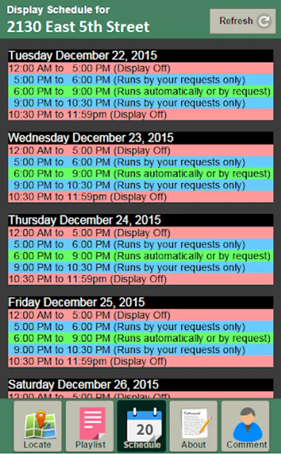 You can view the current status, playlist, and hours of operation for Christmas light displays that are controlled by the SyncLights software. You can also request songs. This app requires you to be present at the display itself. It only works with displays using the SyncLights control software.