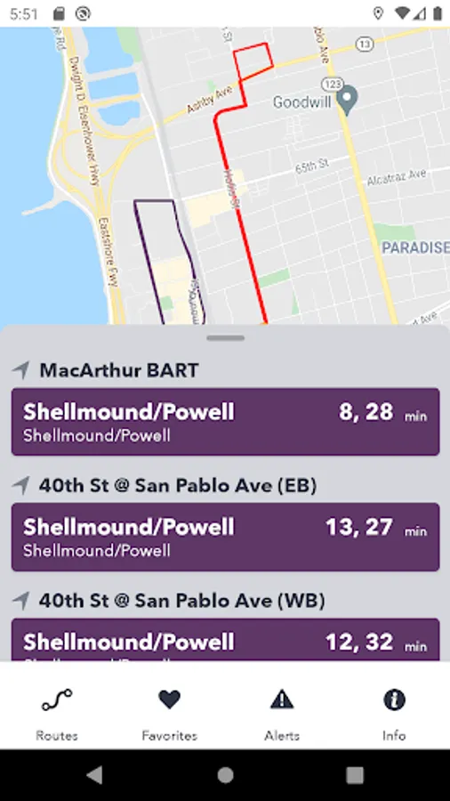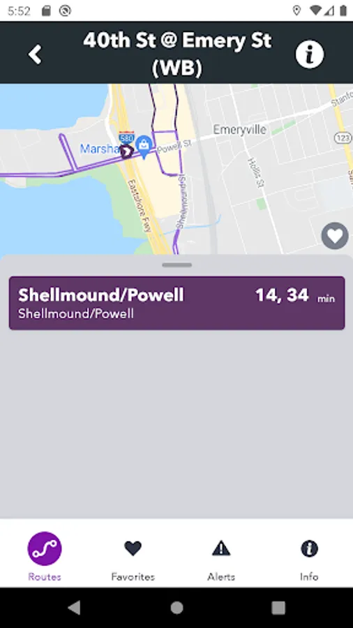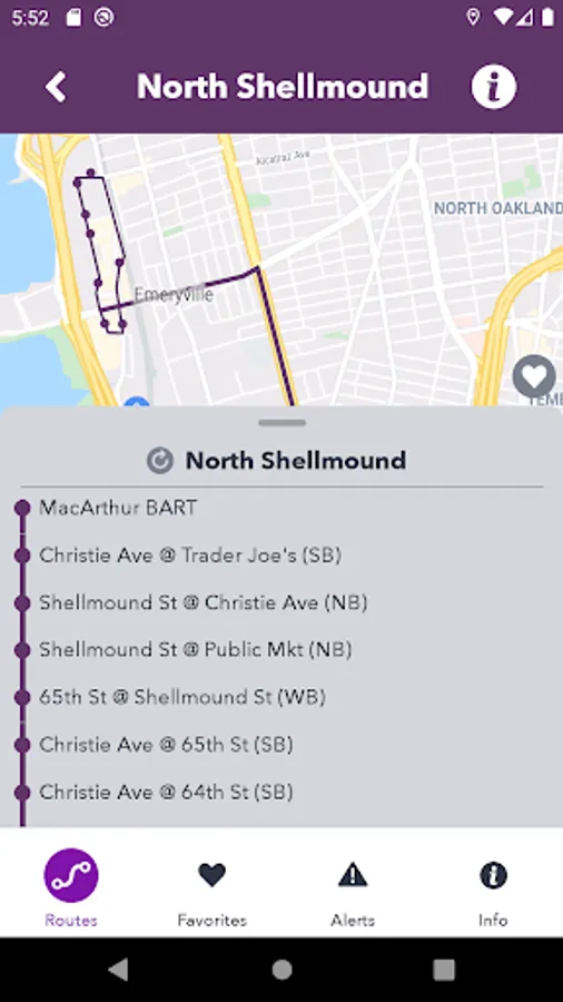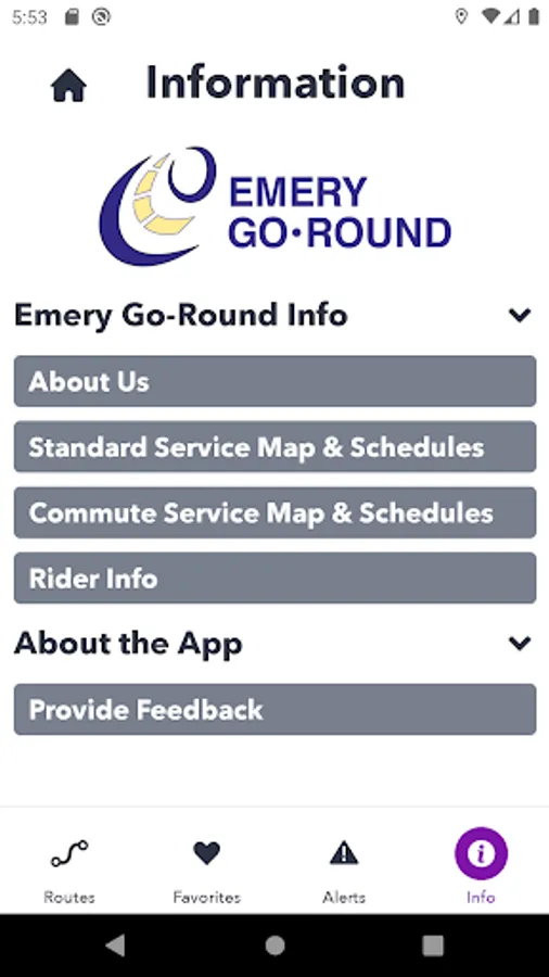 EmeryGo provides real-time tracking arrival information for the Emery Go-Round shuttle service, in Emeryville CA. Use the app to mark favorite stops and routes, set