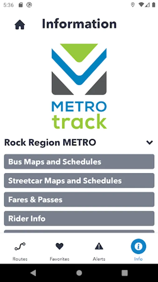 Metro Track provides real-time arrival information for the Rock Region METRO (Central Arkansas area) public transit system buses. Use the app to mark favorite stops and routes, set reminders, get alerts, plan your trip and access general information.