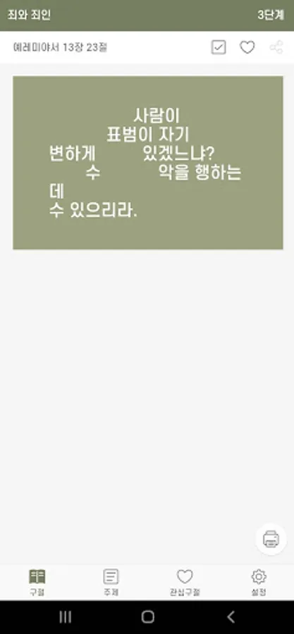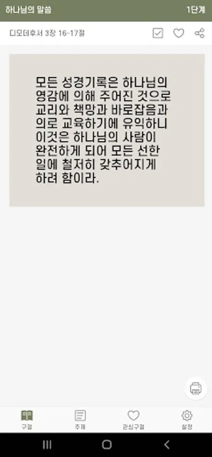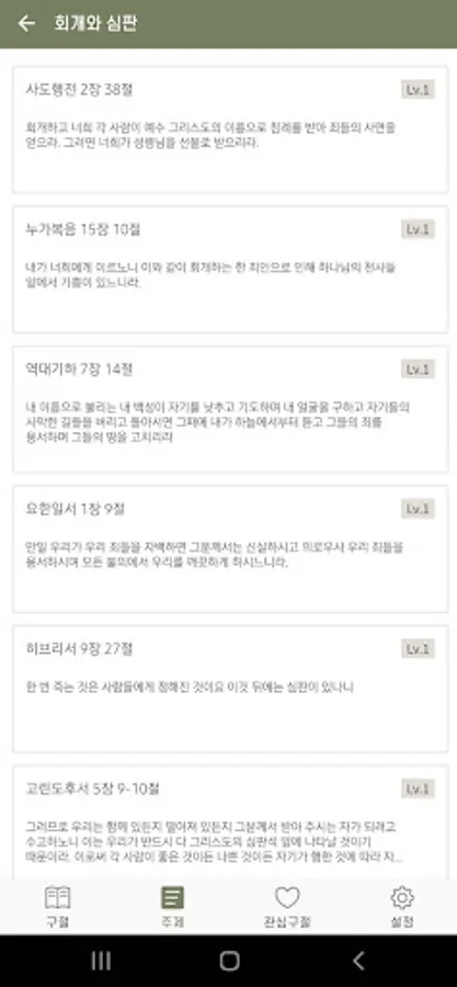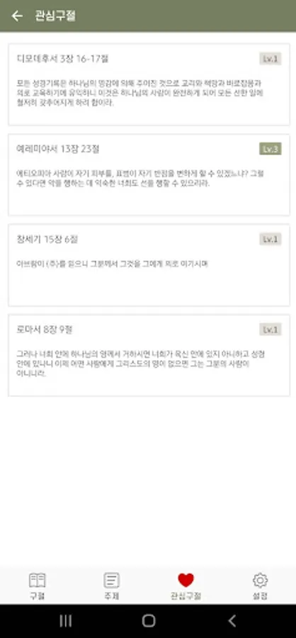 - Bible memorization can be divided into 4 steps. When you recite each verse, if you increase the level, the words in the recited verse are deleted in the middle to help you memorize.