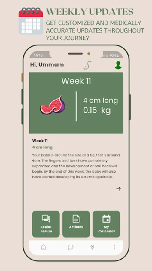 Weekly Updates: Receive customized updates on your baby's development and changes happening to your body, all tailored to your specific week of pregnancy.