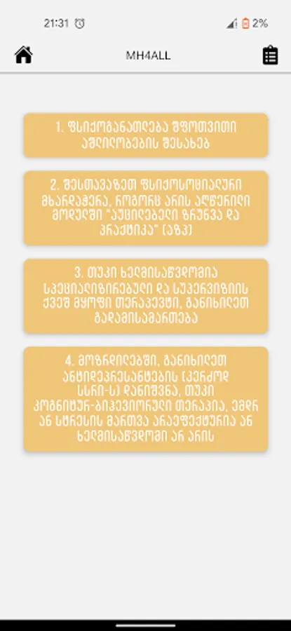 The app aims to empower PHC doctors in assessing and managing mental health problems. It was created by "Global Initiative on Psychiatry - Tbilisi" with the financial assistance of the World Health Organization and the European Union. Its contents are the sole responsibility of the author and do not necessarily reflect the views of the European Union.