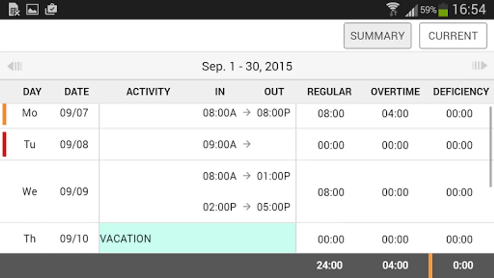 The Synerion Mobile Pro application allows the employees to view their timesheet based on data from the Synerion Enterprise Attendance system. The employee can view daily attendance and absence data, including any errors for a specified pay period. The employee can also view a breakdown of hours including regular, overtime and deficiency hours, and a summary for the period in question.