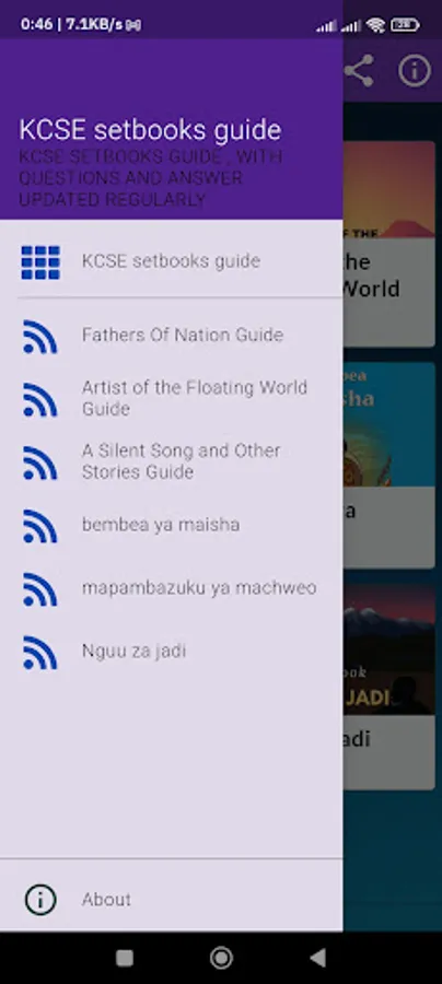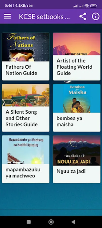 Exam Guides: The app offers detailed guides for each of the examinable setbooks, including Fathers Of Nation Guide, Artist of the Floating World Guide, A Silent Song and Other Stories Guide, Bembea ya Maisha Guide, Mapambazuko ya Machweo Guide, and Nguu za Jadi Guide. These guides will help students understand the themes, characters, plotlines, and literary devices used in each setbook, allowing them to analyze and interpret the texts effectively.