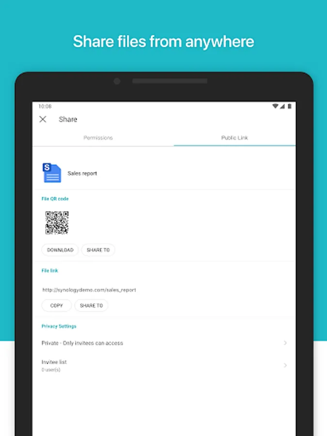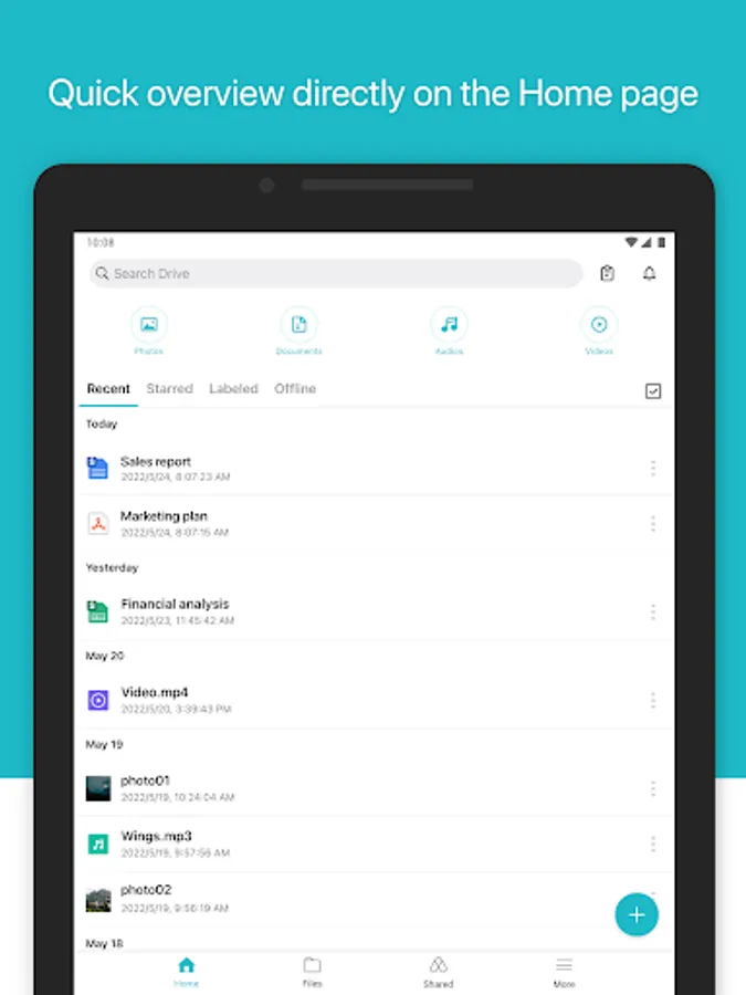 Android Drive allows you to easily access and manage files in your Synology Drive on the go. Apart from common file types, such as documents, images, videos and music, you can also open Synology Office document, spreadsheets and slides in the user-friendly viewer provided by Drive. In addition, the features of searching, sharing, moving and applying labels to files are all available on Android Device, which allows users to complete tasks efficiently anytime, anywhere.