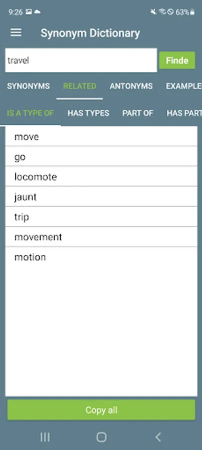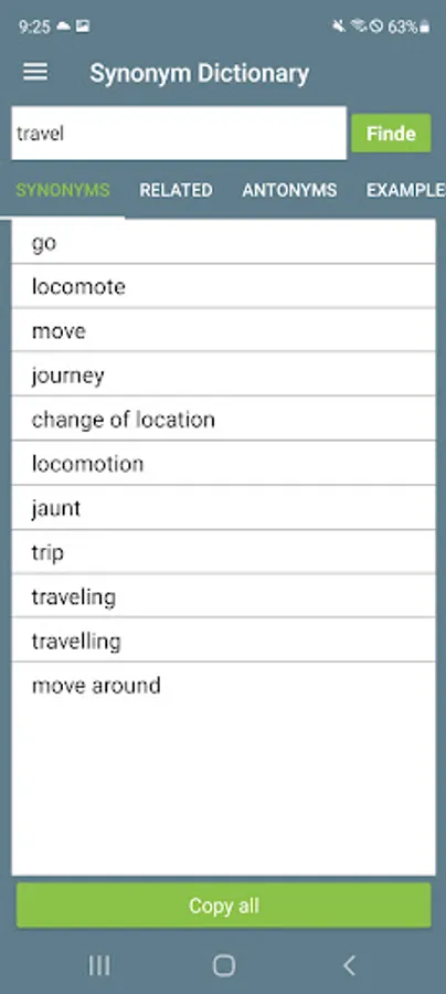 Synonym Dictionary app lets you retrieve information about English words, including definitions, synonyms, rhymes, pronunciation, syllables, and frequency of usage. It also can tell you about relationships between words, for instance that "math" has categories like "algebra" and "geometry", or that a "finger" is part of a "hand". This free dictionary of synonyms and antonyms will help you quickly find the most relevant words and related associations. You just need to enter a word and click "search". You will be immediately provided with the words closest in meaning.
