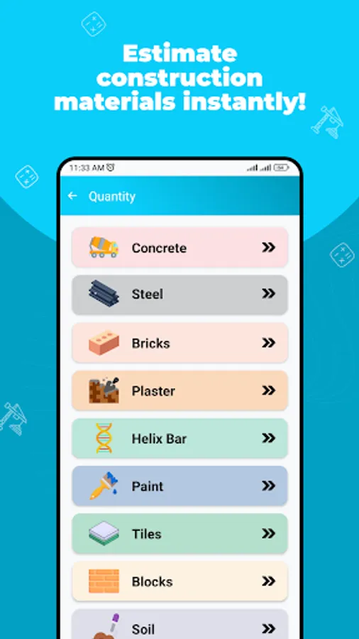 Quickly estimate materials for Reinforced Cement Concrete (RCC) structures. Input values for beams, columns, or slabs and get instant results for cement, sand, aggregate, and steel reinforcement.