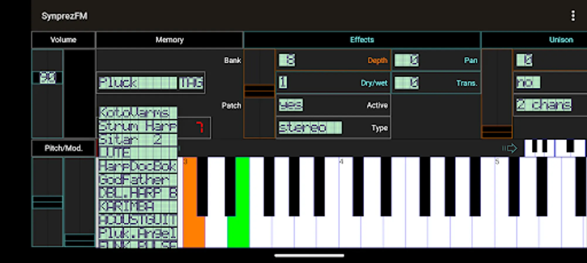 While you play, you can trigger an after-touch vibrato effect by dragging your fingers on the active keys or shift the keyboard to different octaves. Other performance parameters can be accessed above the keyboard, including 2 types of portamento, a sensitivity range for pitch or volume modulations, and some effects that give a sense of depth when using a headset, especially on plucked sounds. You can also adjust the polyphony to adapt to your device capabilities. Thanks to an optimized core, you can hear up to 16 channels playing together, even on mid-range devices.