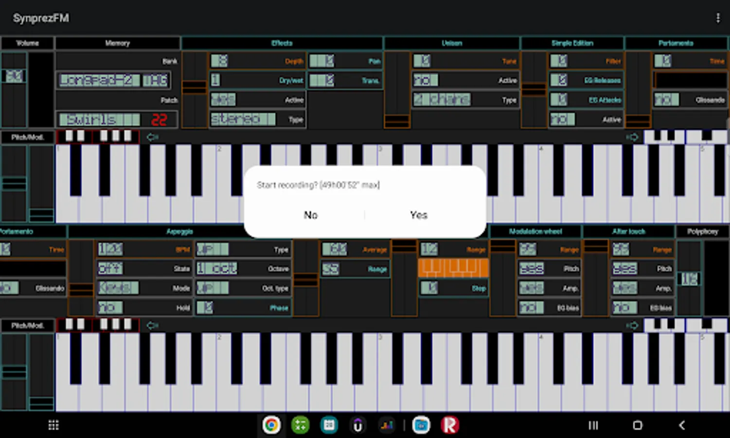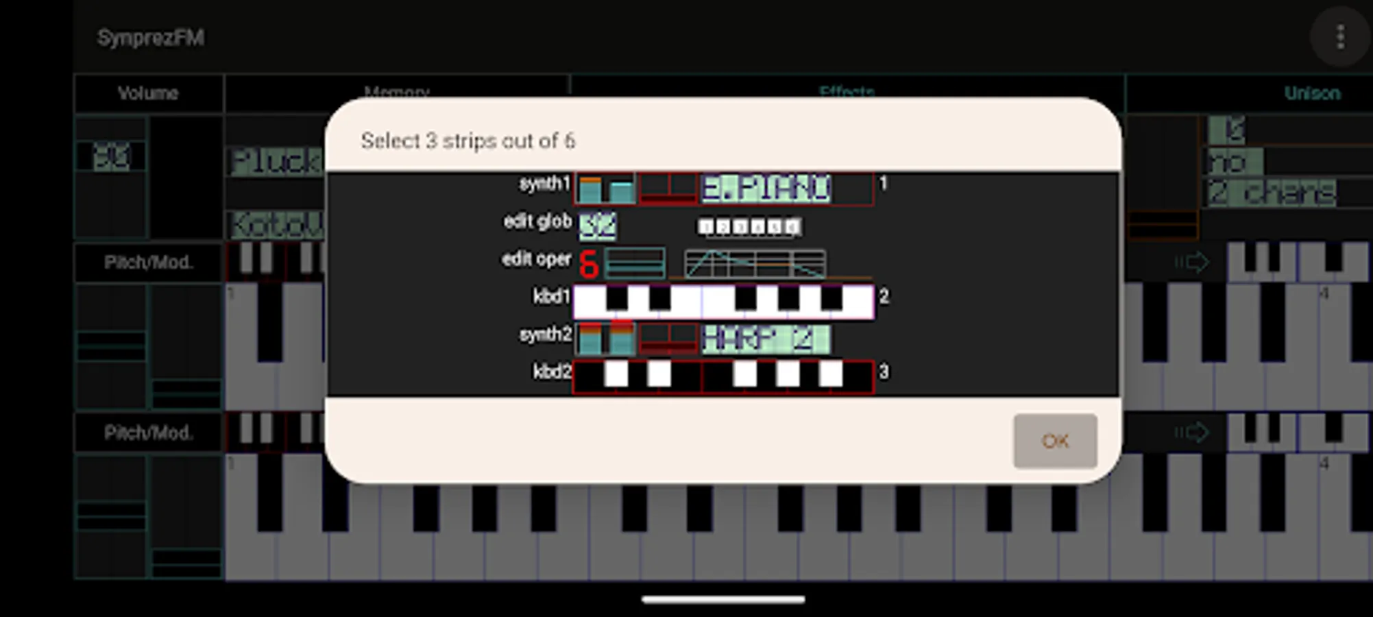 SynprezFM 2 is also a Yamaha DX7 emulator, that can render with accuracy the sysex files you upload into an external storage directory setup by menu, in order to heighten the experience. You can also create and save your own patches, either by editing one of the (deliberately) unsorted builtin ones, or starting from scratch with the 'init voice' function.