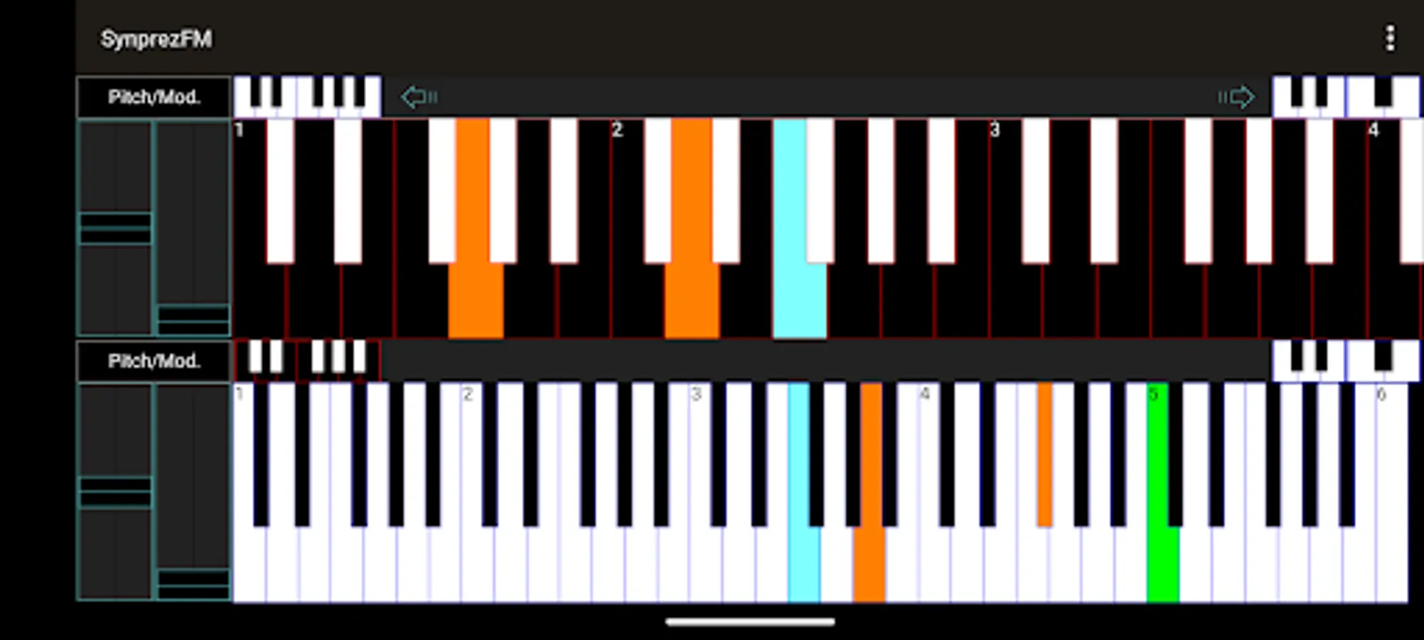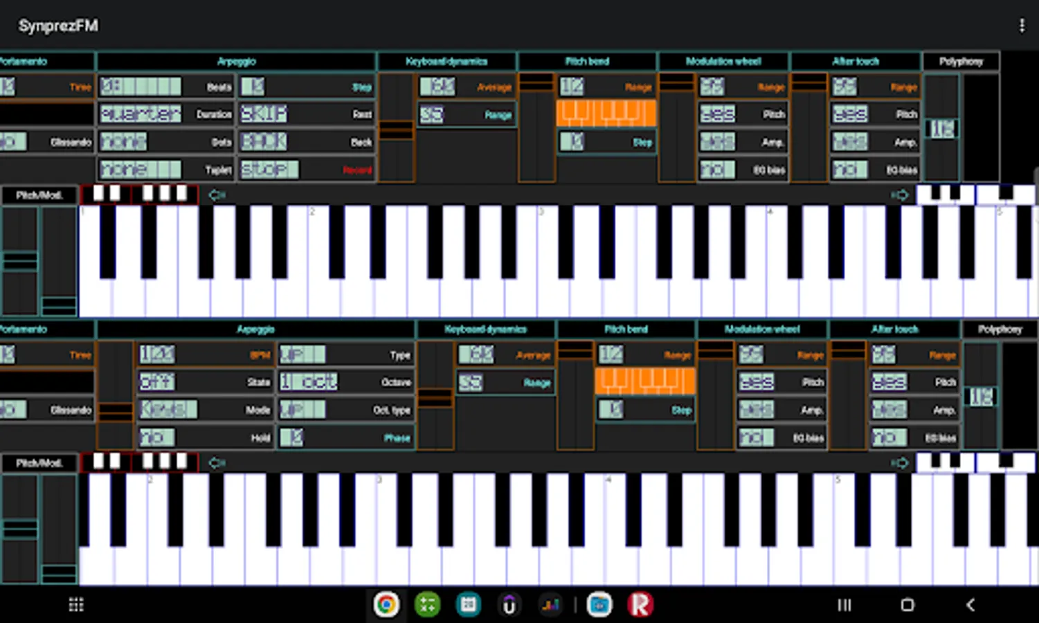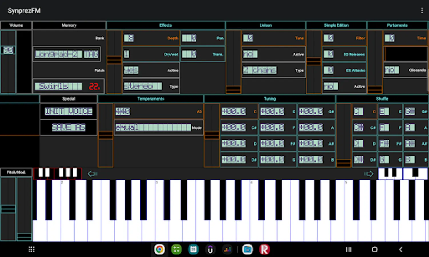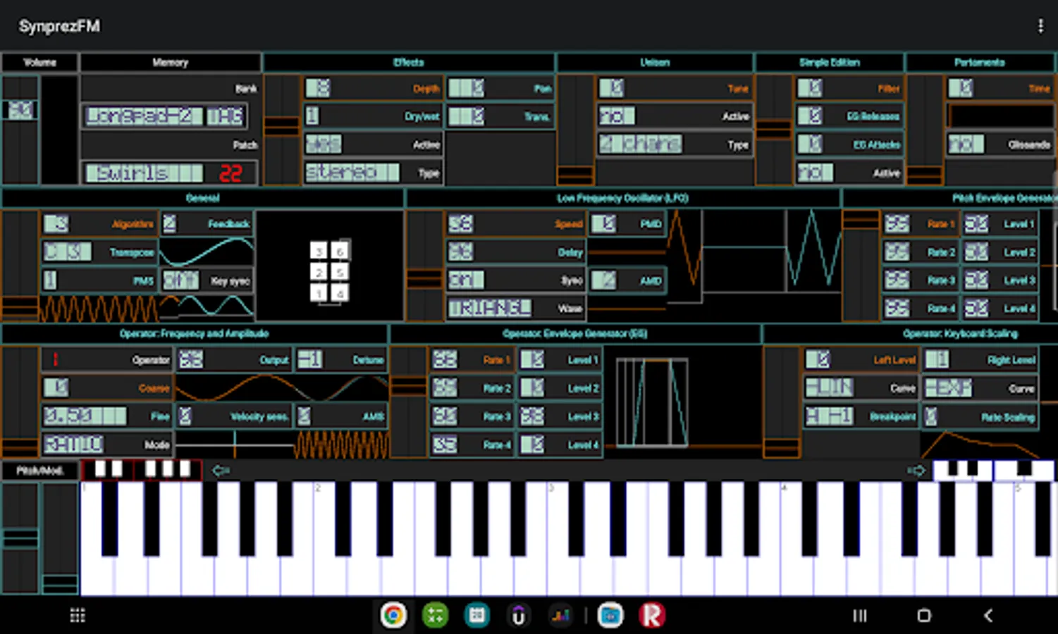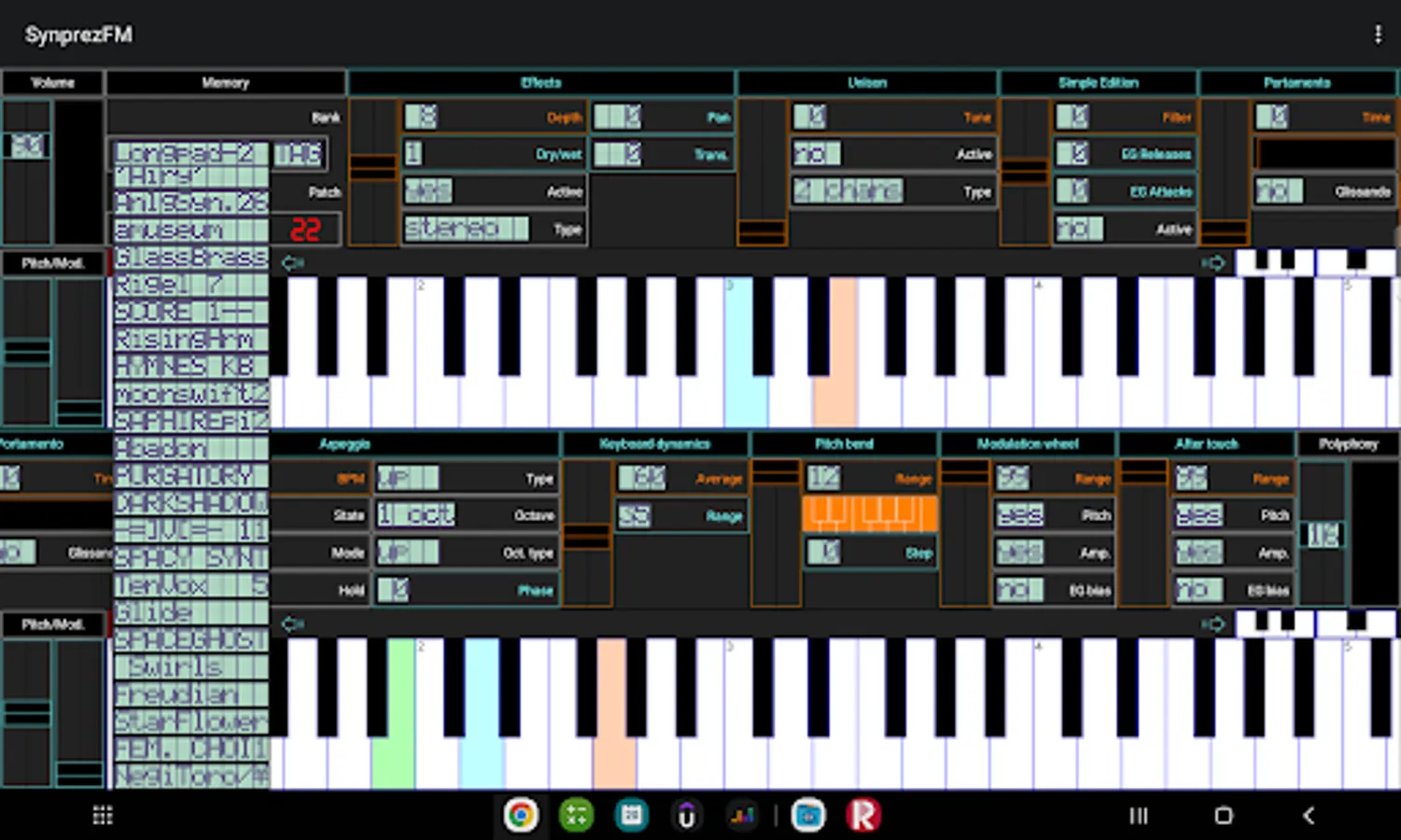 SynprezFM 2 is a programmable polyphonic synth with a multitouch dynamic keyboard, arpeggio, effects and 1024 built-in instrument patches. It uses Frequency Modulation, a lightweight method for generating complex harmonic waveforms by mixing or combining sine samples controlled by envelops and LFO. It is able to produce analog style pads, to emulate classic or modern instruments, or to invent new and awesome crystalline sounds.