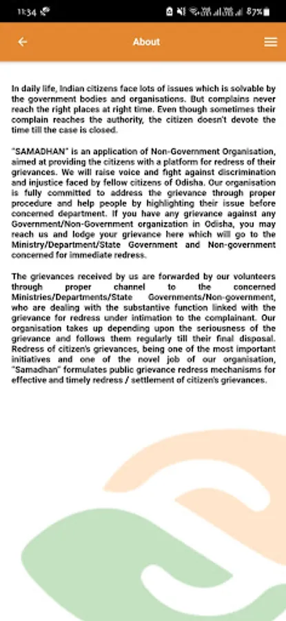 Samadhan means Solution. The app does just that for you. It's a platform where anyone share their grievances to any respective government body. That can be regarding roads, cleanliness, crime, public property.