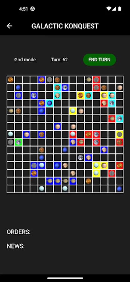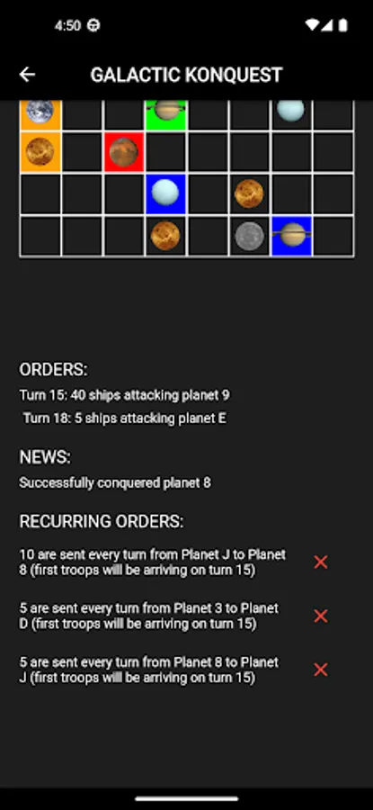 Each turn you may dictate the orders that you wish your troops to execute (moving ships from planet to planet, attacking others...). An order takes as many turns to complete as the distance between the origin and destination planet. And remember, be strategic. There are planets which are better suited towards production (producing more ships per turn) and there are planets that are more geared towards attacking (with higher strength values). You should use reinforcements wisely, maintain adequate but not excessive garrisons, and always be close to the action. Easier said than done!