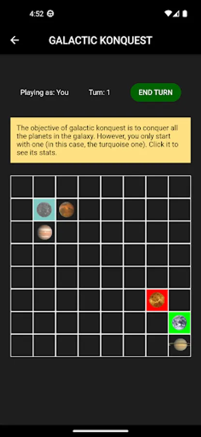 Galactic Konquest is a multi-player turn-based strategy game. Your objective is to conquer the whole galaxy from your starting position holding just one planet, crushing your opponents (both other human players and AI) in the process.