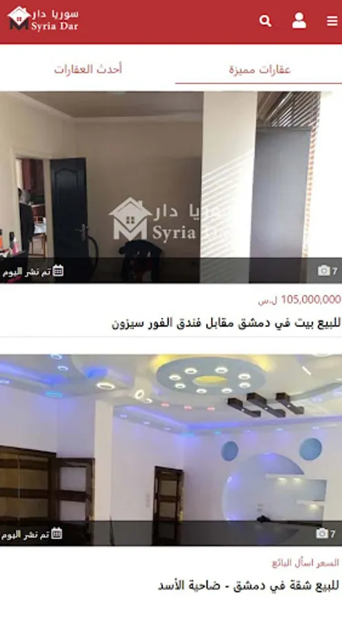 The application and site Syria Dar Al-Tijari allows you to easily search for properties, distinctive properties and integrated data, properties for sale, real estate for rent, apartments, villa, shops
