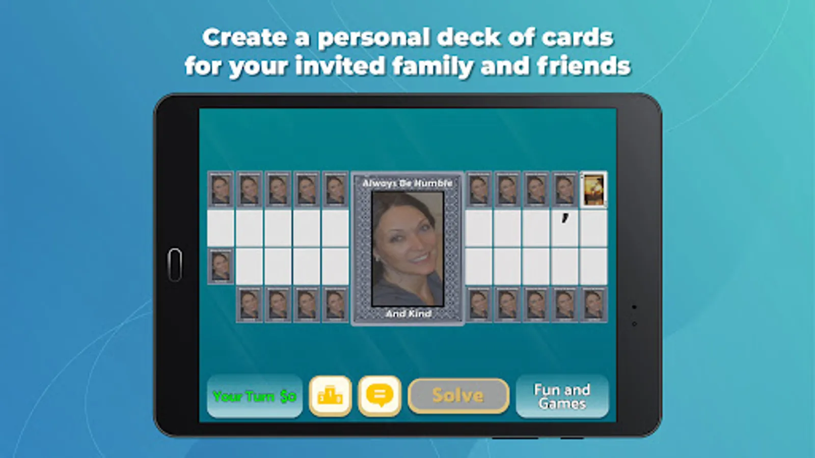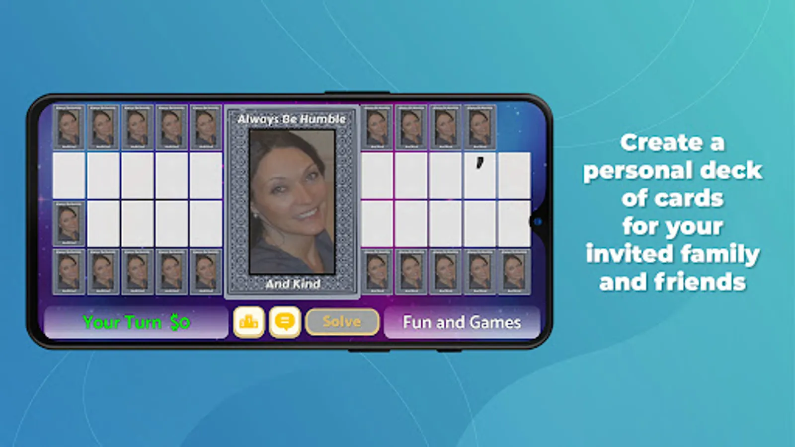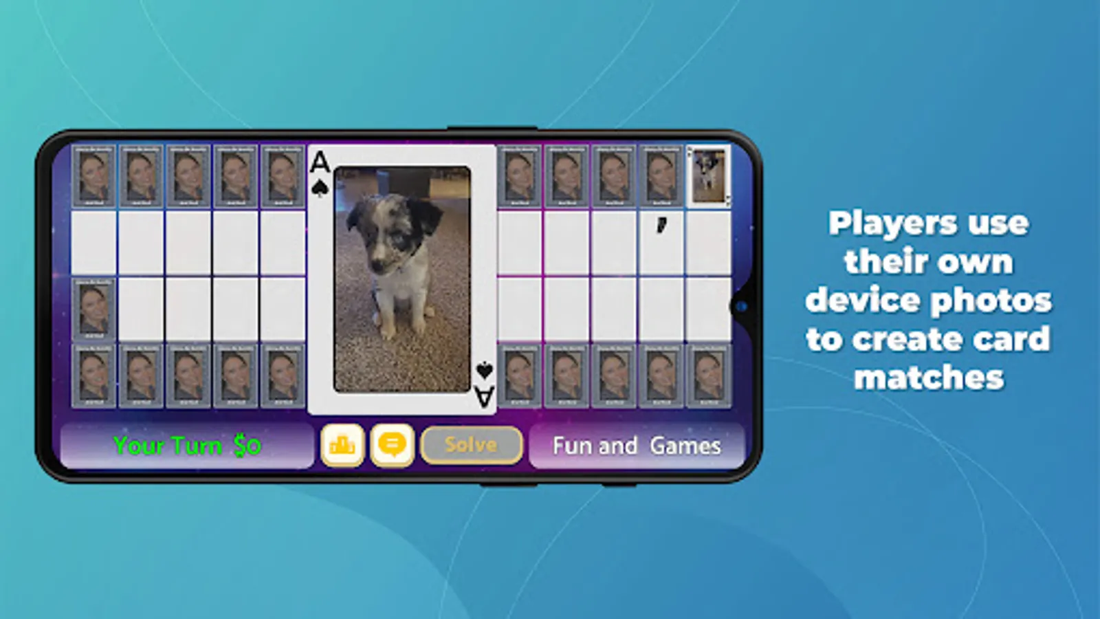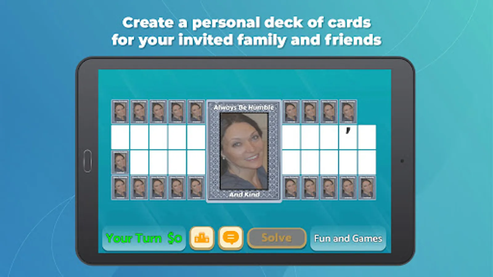 Challenge family or friends to a game of Deal of Fortune! Compete to solve the puzzle and earn the most “game money”! Use your own photos as the cards to match to send a special message to loved ones and create a personalized game.
