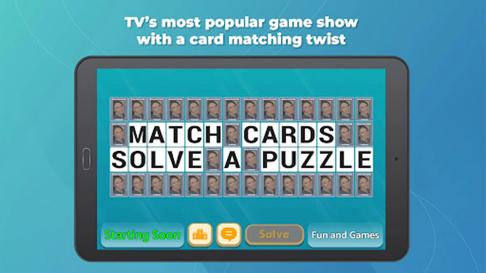 Your favorite game show word puzzles combined with the classic memory game. Find a card or photo match and spin the wheel to guess letters in the puzzle. Solve the puzzle and earn “game money” for in-app prizes.
