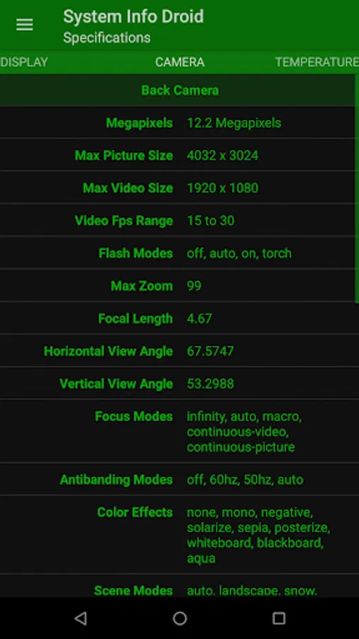 * Detailed device specifications (CPU, Cores, Graphic Chip, WIFI & Mobile Networks, Sound Chip, RAM Memory, Storage, Screen, Camera, Temperatures, Battery, Sensors...).