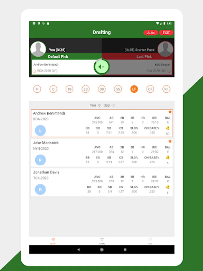 Create as many teams as you like using players from the current season and the All-Time Hall-of-Fame set! When you’re ready, create a game and find an opponent. Two players to a match, and both teams are merged in a draft pool. Once the clock starts, you both take turns live drafting the best team from the available player pool, a true test of strategy. Once the draft is done, the pressure is on as you set your lineup and pitching rotation.