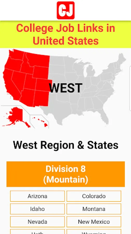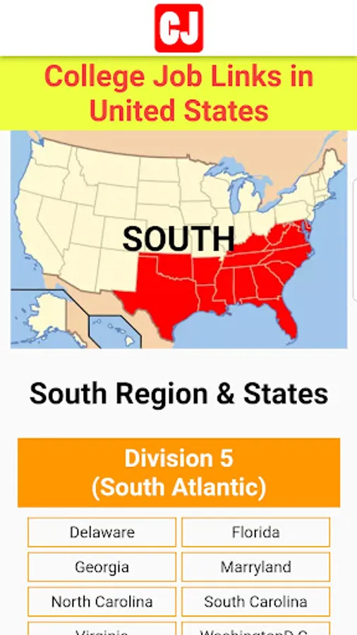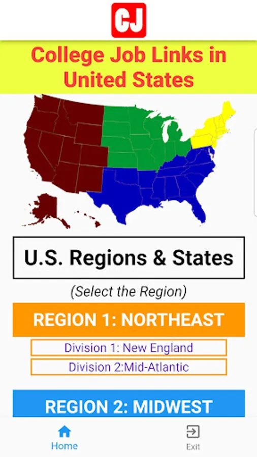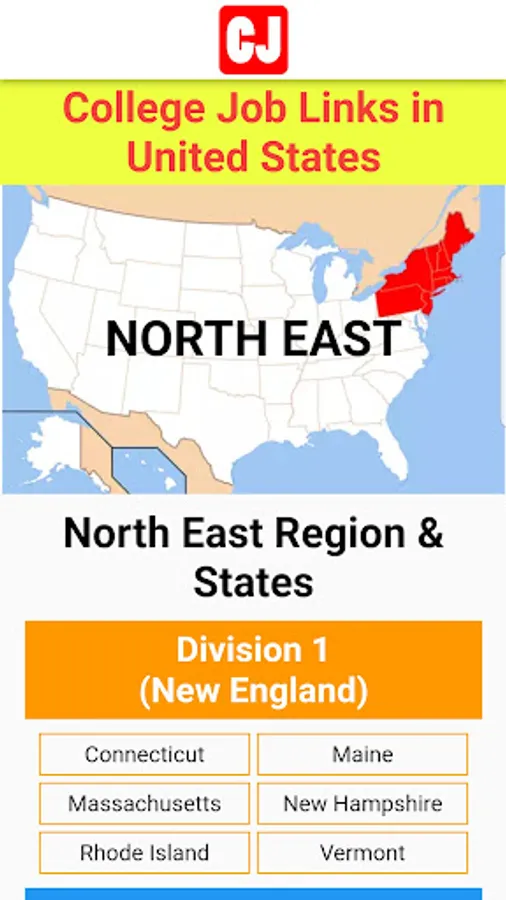 - Initially, this app covers the universities and colleges of 9 states of the New England and Mid-Atlantic divisions of North East Region while 5 states of East North Central Division of Mid-West Region (total 14) will be covered. Job links in the remaining states and regions of United States will be published in the upcoming versions of the app.