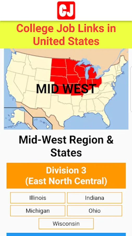 - The names of the states of Mid-West Region, the job links of the universities published in this app, are; Illinois, Indiana, Michigan, Ohio and Wisconsin.