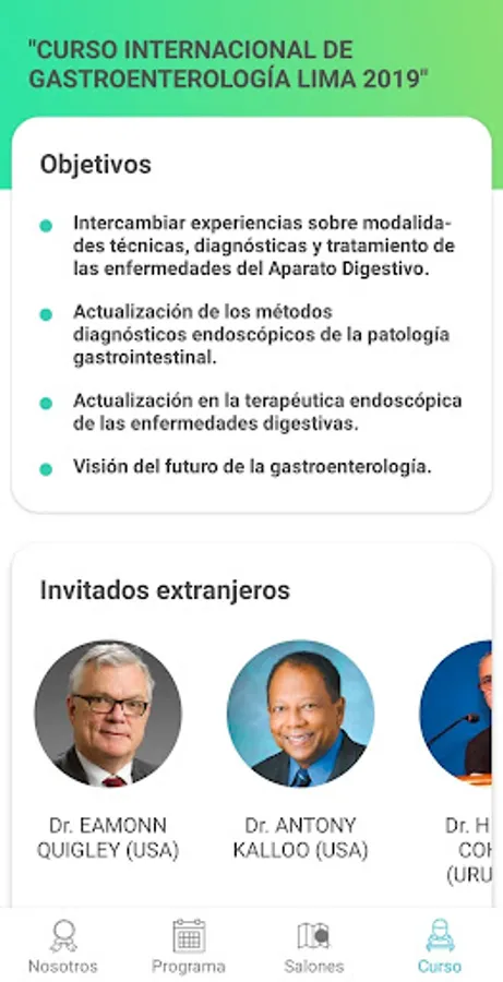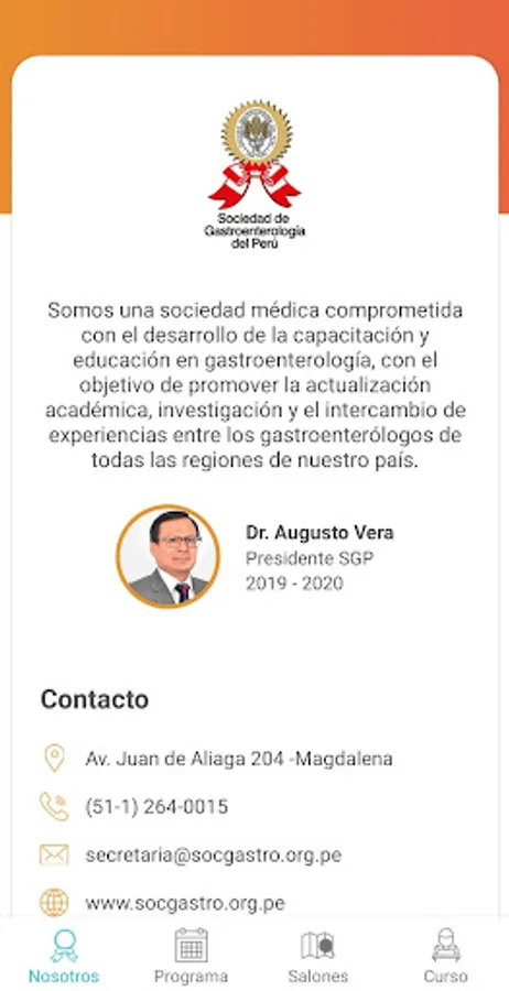 This application has been created to disseminate the program of the International Course of Gastroenterology Lima 2019. To be held in the city of Lima, Peru, from August 28 to 31, 2019. But also, it will allow us, from now on, to have the official program, of all courses, congresses, scientific sessions and conferences organized by the Gastroenterology Society of Peru, and provide relevant information on academic activities of other societies or related medical associations both in Peru and abroad, which allows Quick to the medical users, schedule their educational activities.