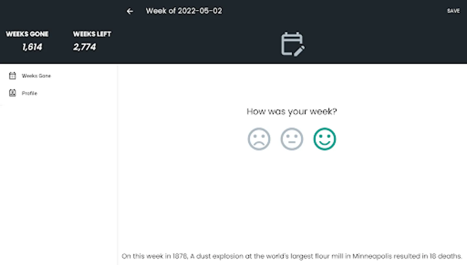 As each week passes you can rate how your week went, get a reminder if you missed a rating and see major events that happened on that week from Wikipedia. All this in a modern, material design app.