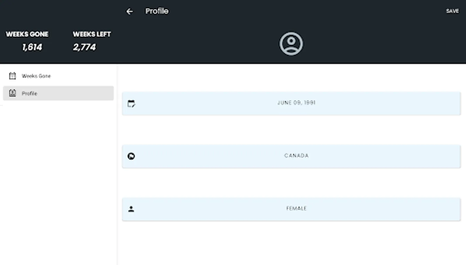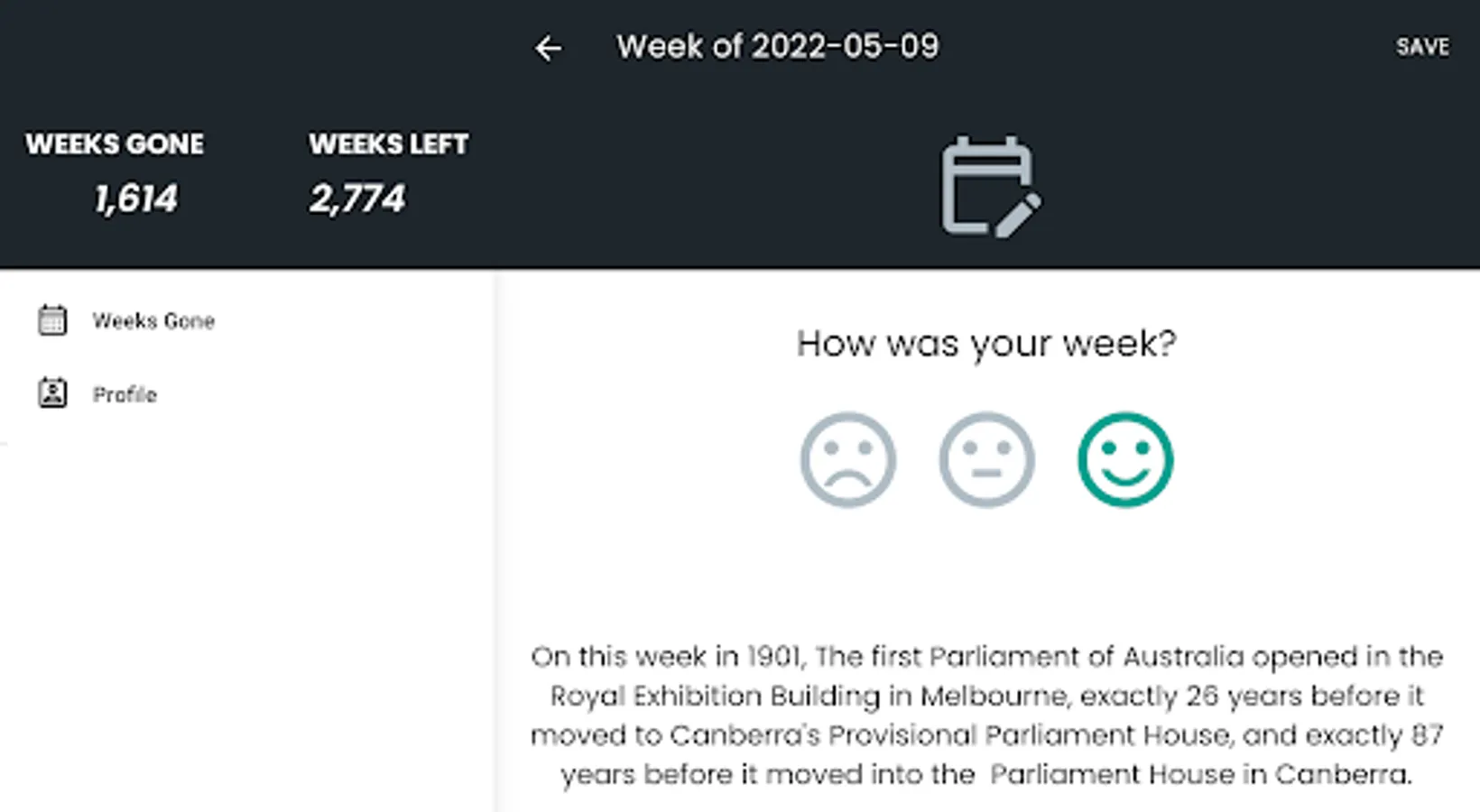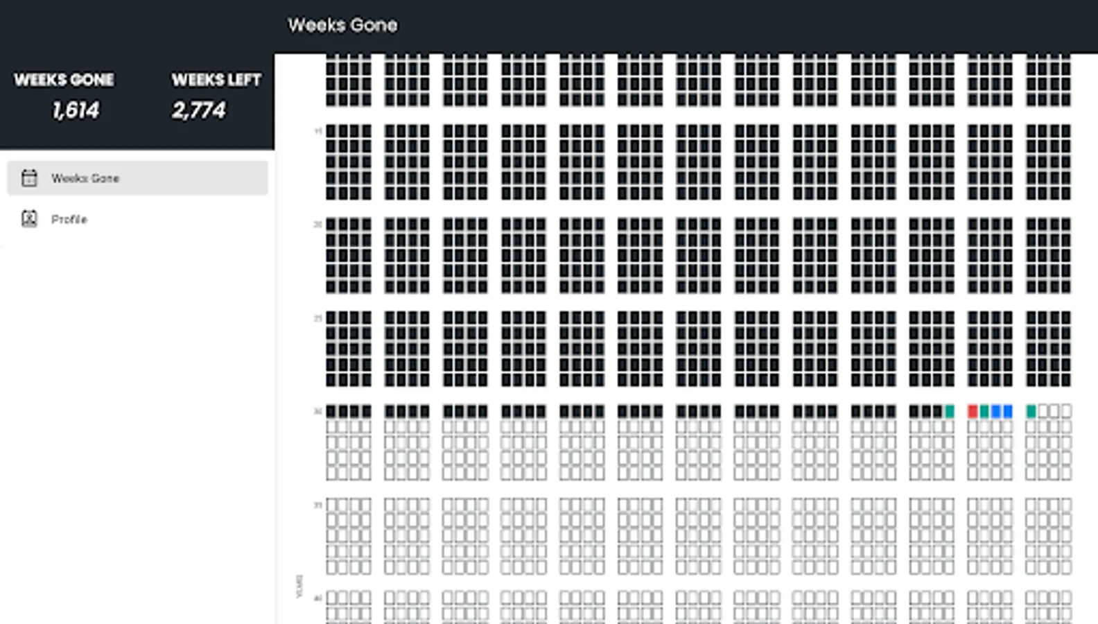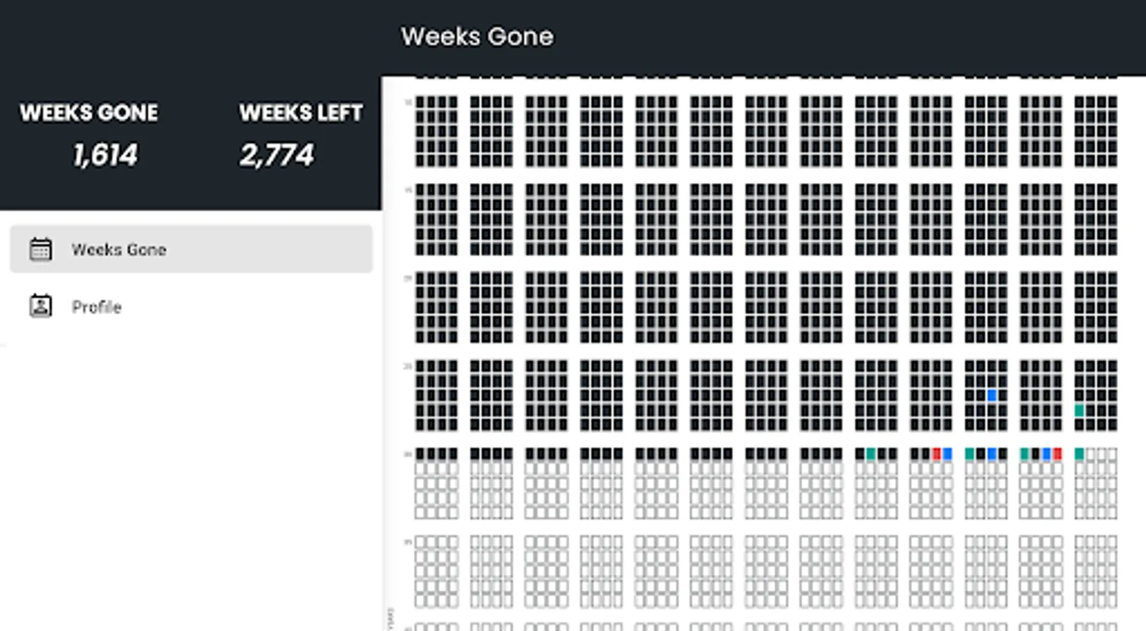 Weeks Gone helps you ensure each week you've lived is not wasted, and that you're cognizant of the time passing by to ensure you're living in the moment.