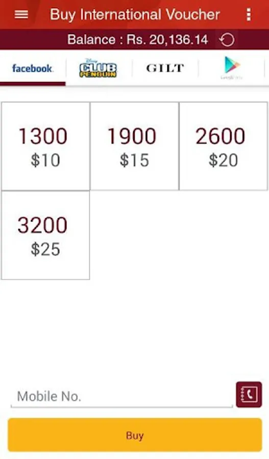 - Buy International vouchers for Facebook, Club penguin, GILT, Google Play, hulu Plus, iTunes, Netflix,