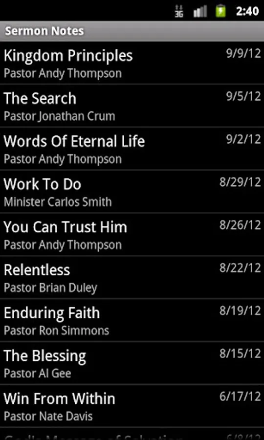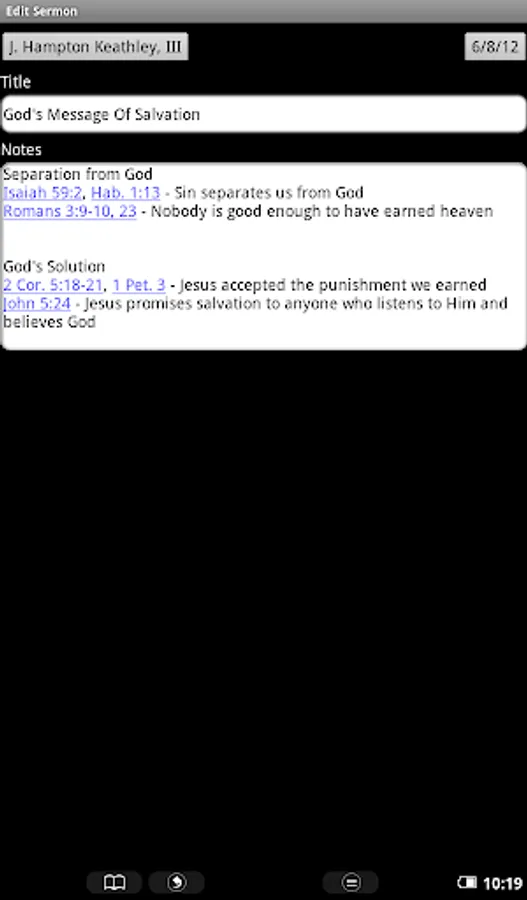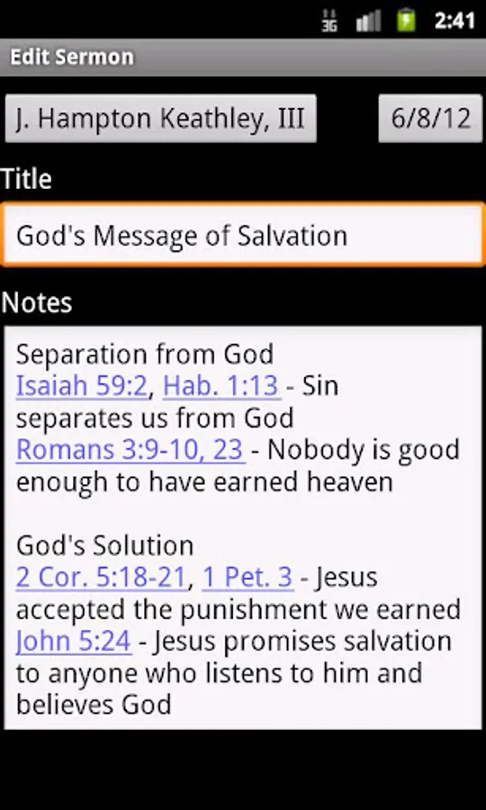 Sermon Notes helps you take detailed sermon notes during church. You can enter the pastor, title, and date with each sermon. It also recognizes bible verses, and pressing and holding a verse will instantly display the scripture online or in a supported bible program - no more looking through menus to get to the verse you want to see. Search is fully supported, and you can also send sermon notes using email.