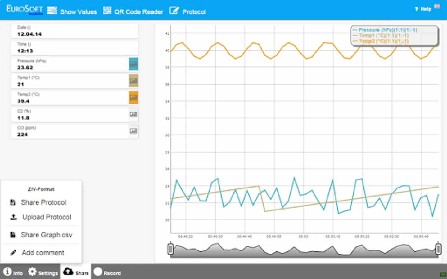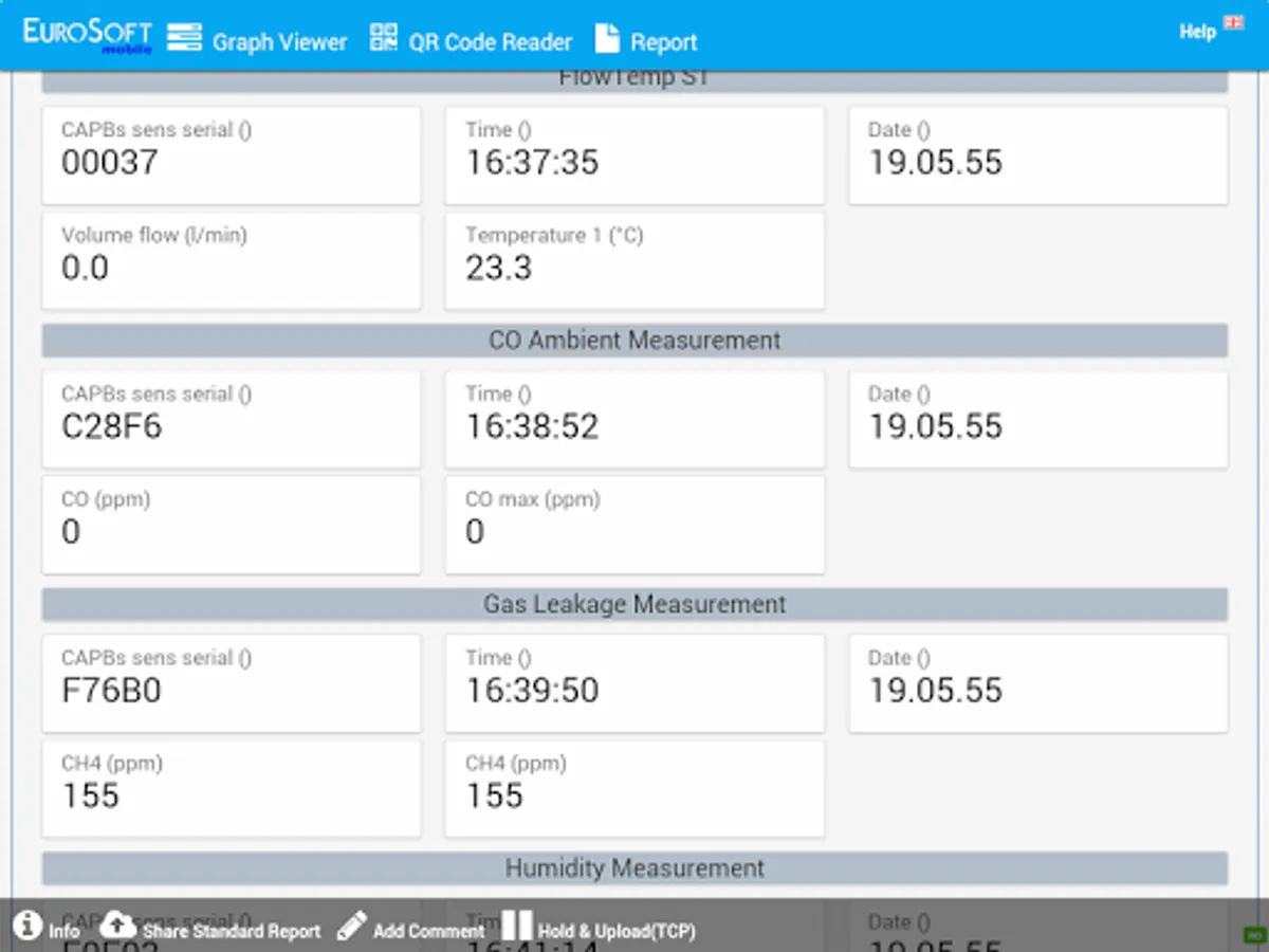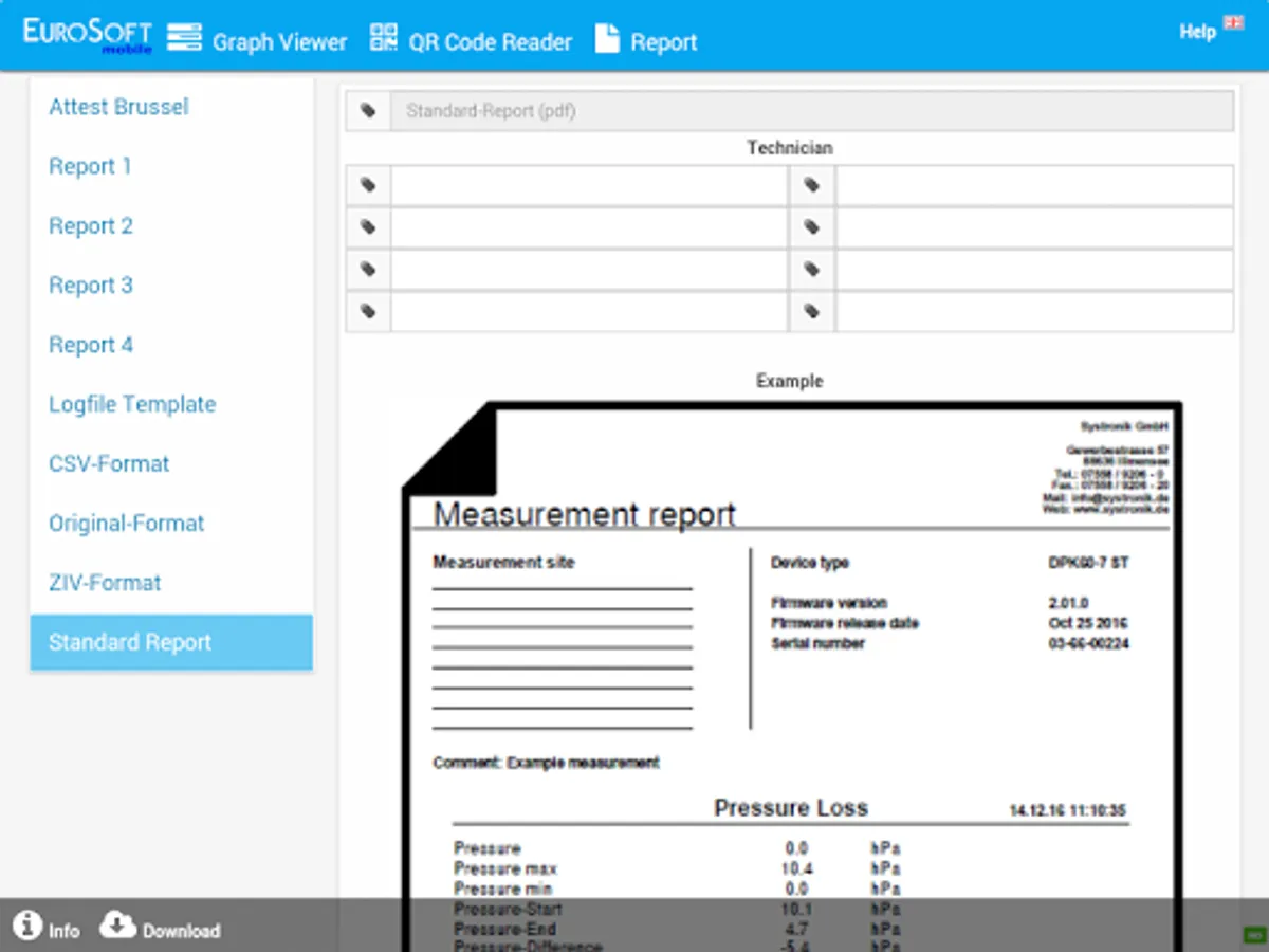 The measurement data can be stored in a graphic and sent via e-mail or social networks. In connection with the PC version of EuroSoft mobile, the user can create HTML-specific reports or use standard pdf reports to store the measurement data.