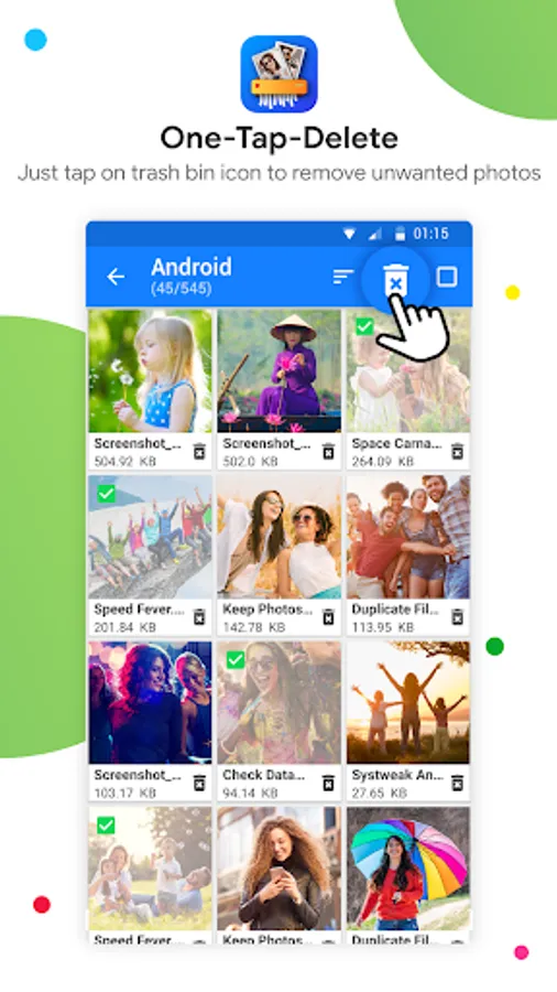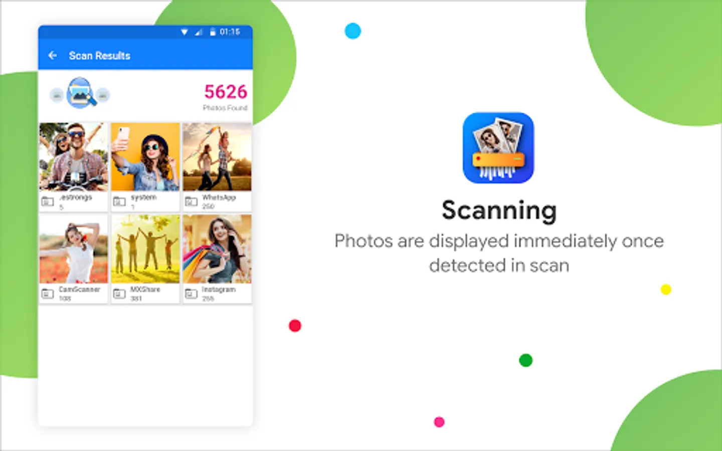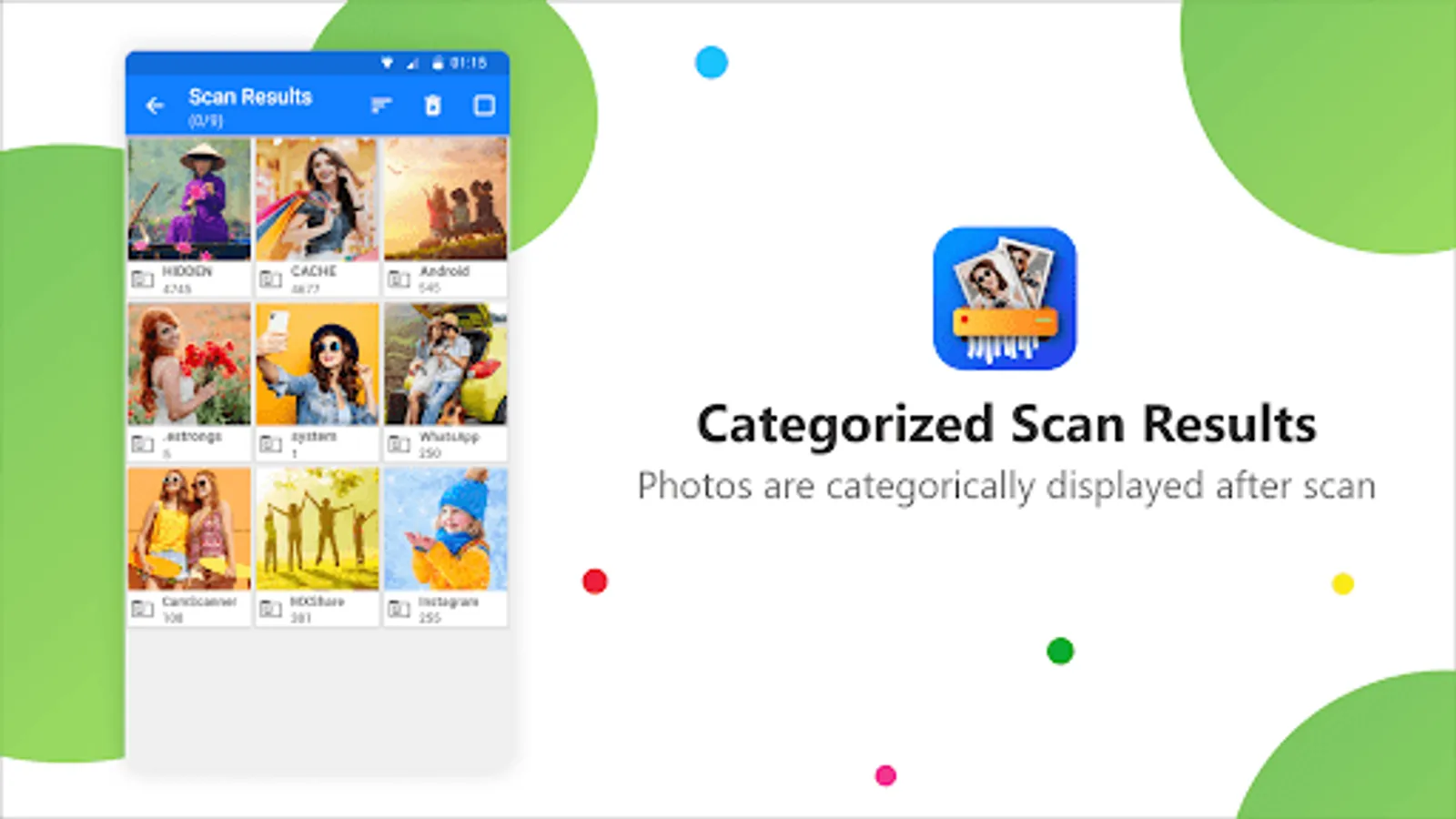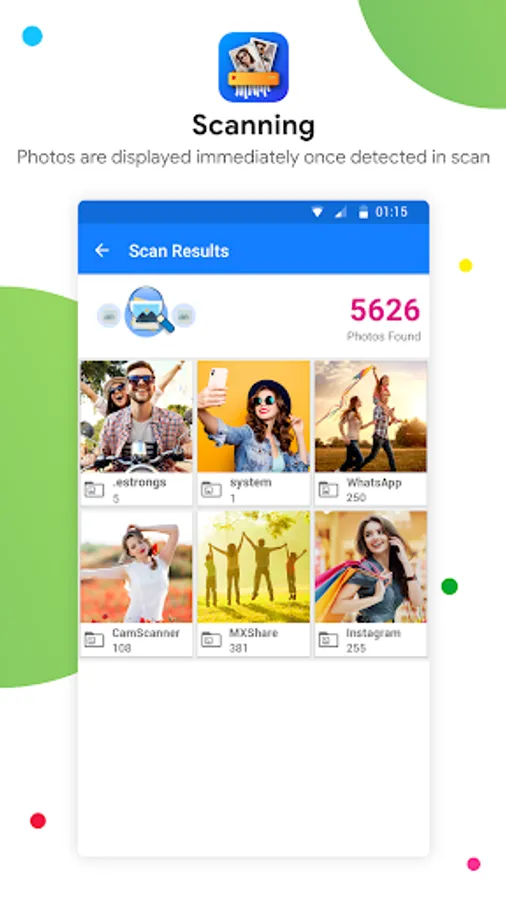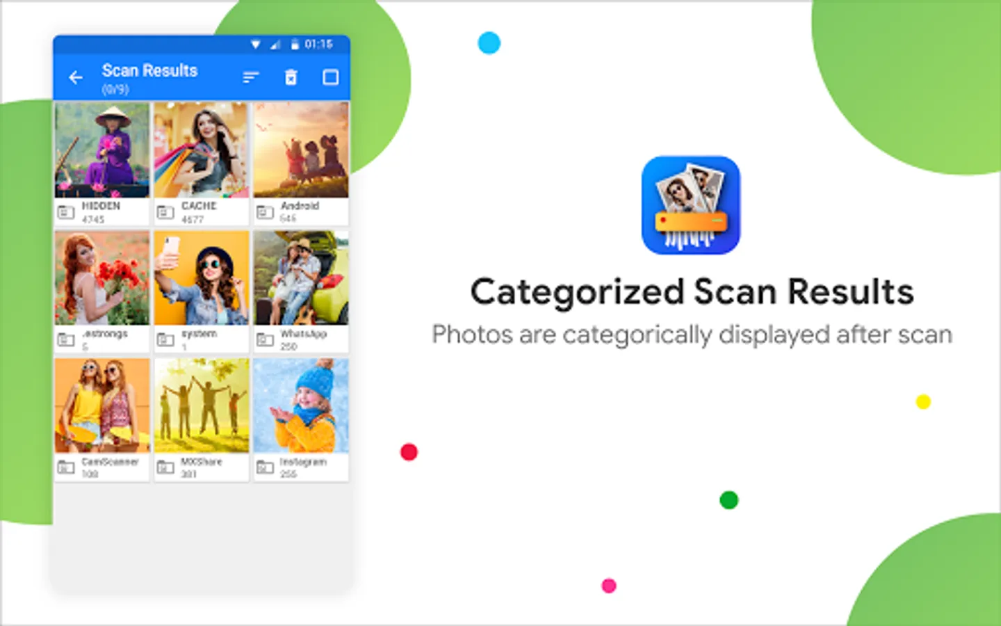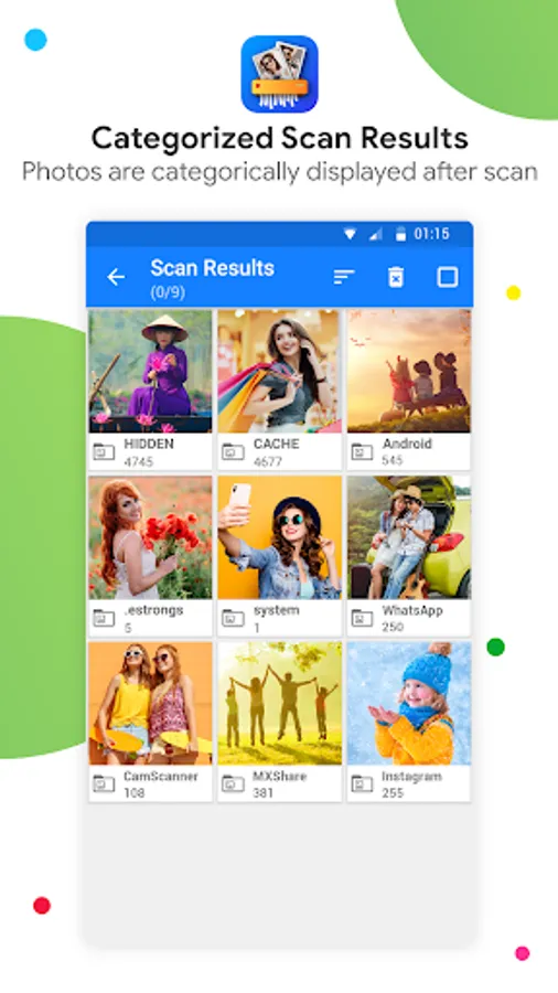 The Photo Cleaner App scans areas in the phone that are not usually accessed by other Apps. This makes sure that the hidden pictures, leftover images and junk image files or thumbnails that you would otherwise miss in routine scan, will be made visible, and you can delete them at ease.