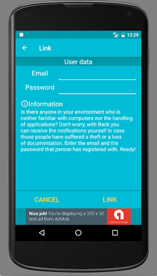 Follow these steps: Enter the application (web or app on your mobile) and register that person as you registered yourself (in case that person does not have email account, create one). Access that email and click on the link of the message received from BACK. Open the app on your mobile device, press the button at the bottom right and press the "Link" option. Enter the email and the password you registered that person with. Ready!