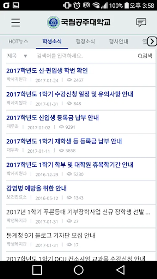 Common: Main board, Academic Calendar, diet, club, identification, libraries, universities, institutions descriptions, campus maps, newspapers gongjudae, Links, 1: 1 counseling, Push notifications, etc.