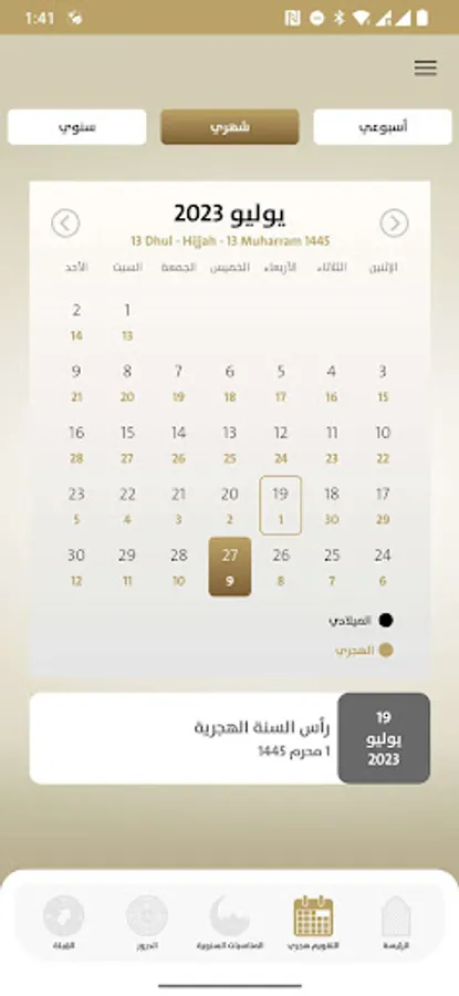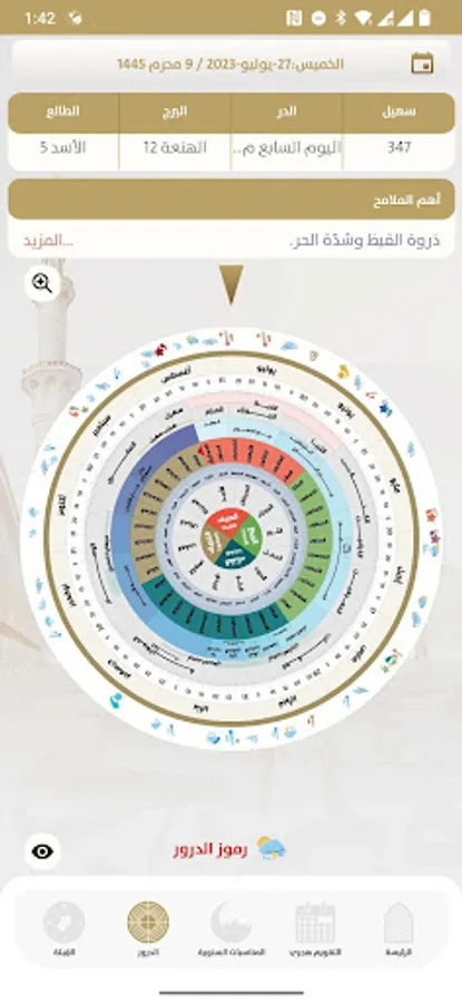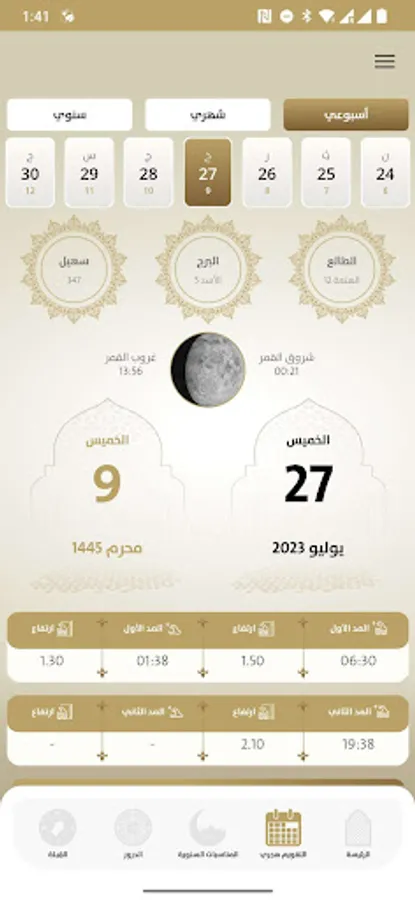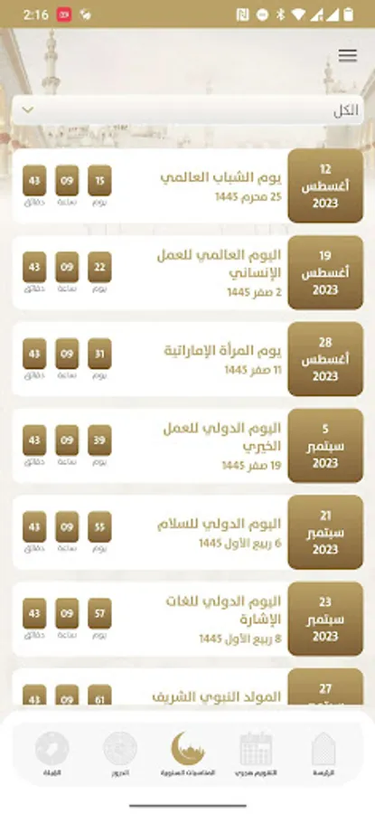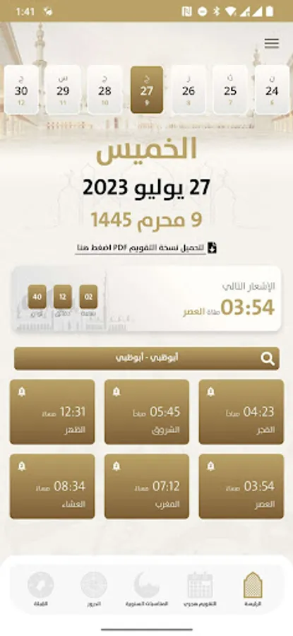 نضع بين أيديكم تطبيق التقويم الهجري التفاعلي، والذي يشمل كل ما تحويه (الروزنامة الورقية) من أجندة ومعلومات إضافية وخصائص فريدة في قالب تقني فريد سهل الاستخدام. ويُمكِنكم من خلال التطبيق التعرف على مواقيت الصلاة والبروج والدُّرور والطّوالع والمواسم، والمناسبات السنوية، وحركة المد والجزر، ليشمل بذلك كل ما تحتاجون إليه. ويتميز التطبيق بسهولة إتاحته معرفة مواقيت الصلاة لجميع مدن ومناطق دولة الإمارات العربية المتحدة كلٌ على حِدَة، من خلال الضغط على الإعدادات، واختيار المدينة التي ترغب بمعرفة مواقيت الصلاة فيها.